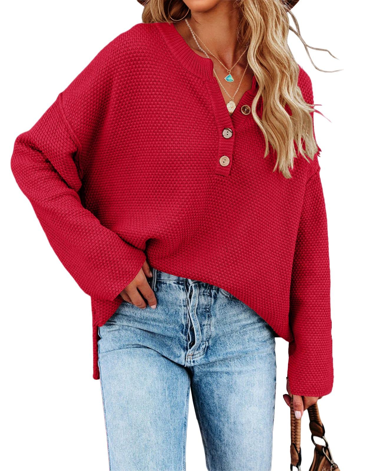 Oversized pullover sweaters features: v neck, crew neck, button up, batwing tops for women, womens henley tops, comfy, casual slouchy style, loose fit, side split, drop shoulder, solid plain color knit blouse.