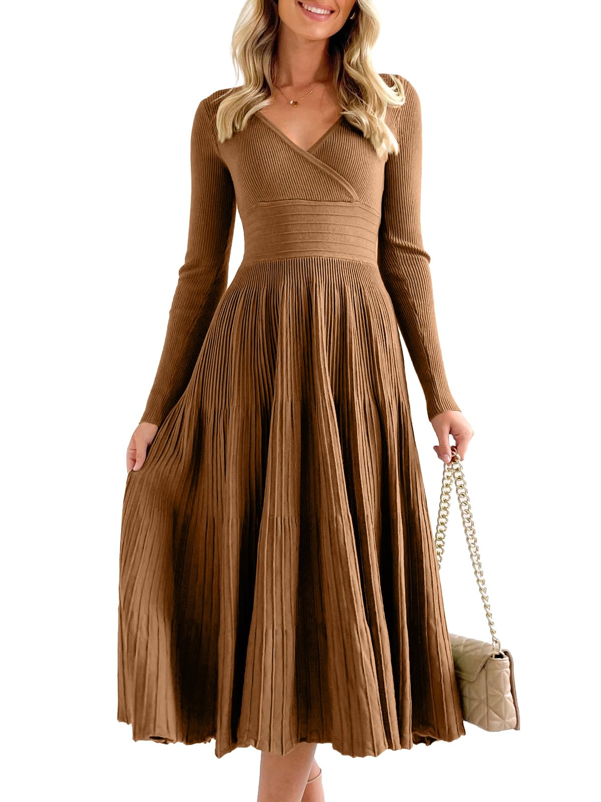 Upgrade your wardrobe with this Long Sleeve Pleated A Line V Neck Elegant Knit Midi Dress. Perfect for the fall and winter seasons, this sweater dress features a wrap style with a flattering V neck design. The pleated A-line silhouette creates a fit and flare look that is both stylish and comfortable. Made from high-quality knit fabric, this flowy dresses is soft, cozy, and perfect for cooler weather. Whether you're attending a special occasion or simply want to elevate your everyday style, this dress is a must-have addition to your collection.