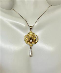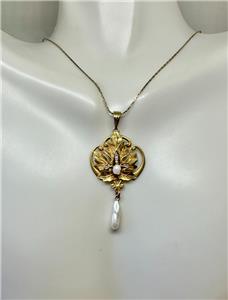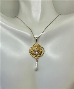 THIS IS A GORGEOUS VICTORIAN - ART NOUVEAU PENDANT IN THE FORM OF A BEAUTIFUL LEAF MOTIF DESIGN ADORNED WITH ELEGANT NATURAL PEARLS.