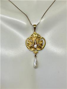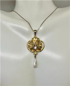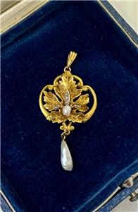 THE FULLY MODELED LEAF IS SET IN A CURVING OPEN WORK SURROUND IN 10 KARAT GOLD. IN THE CENTER OF THE LEAF IS A PEARL ADORNED DESIGN WITH NATURAL PEARLS. AT THE BOTTOM HANGS A LARGE NATURAL PEARL PENDANT DROP.