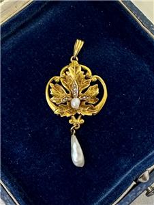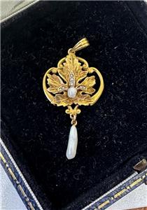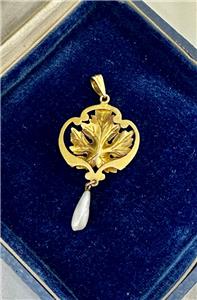 THIS IS ONE OF THE MOST BEAUTIFUL NATURE INSPIRED ART NOUVEAU JEWELS WE HAVE SEEN. THE LEAF HAS WONDERFUL NATURALISTIC FORM AND IS FULLY THREE DIMENSIONAL. THE COMBINATION OF THE ELEGANT LEAF WITH THE PEARL ADORNED CENTER AND THE GOLD RIBBON SURROUND IS EXQUISITE. THE PENDANT IS SO FULL OF ROMANCE AND THE DELIGHTS OF NATURE. THE PENDANT DATES TO CIRCA 1860-1910.