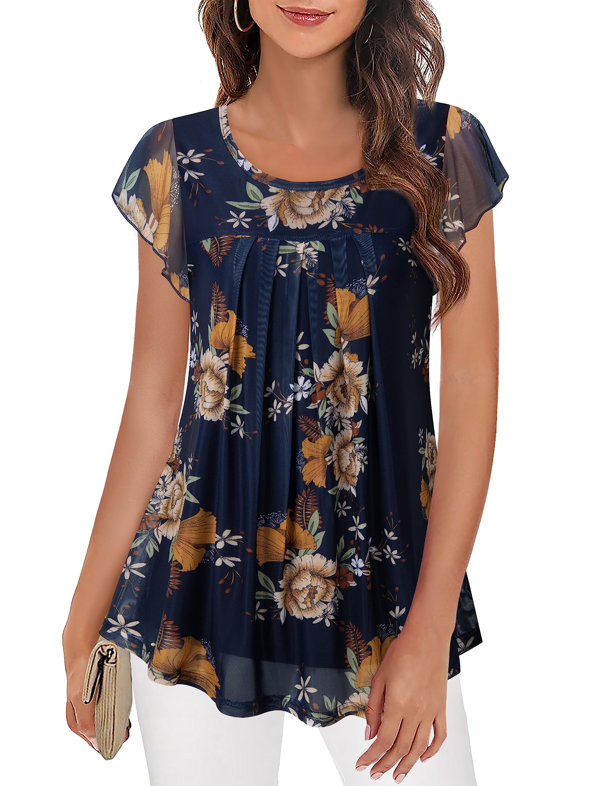 [Premium Material]:This women tunic blouse is made of very comfortable 95% polyester plus 5% spandex blend fabric which is lightweight,soft,breathable and stretchy [Features]:Short ruffle sleeve,round neckline,double layer (mesh outer layer and knitted lining),pleats in front,floral print,curved hem,loose fit style,women summer tops for work casual [Classic Round Neck Design]:Loose crew neck design shows off your slender neck.Pair with necklaces can effectively increase the sense of hierarchy.This summer pleated top design can cover your belly well and make you look slimmer,great for taking pictures. [Flattering Double Layer Design]:The ladies tunic blouse with two layers,it gives the illusion of tight and sexy with a pretty over shirt that keeps it elegant. [Flowying Ruffle Short Sleeve Design]:This tunic shirt for women has wiggle room because of the flowy ruffle sleeves.It can perfectly hide the arm fat,make you look more beautiful,sexy and graceful. [Collocation]:The women tunic top looks great with anything fitted on bottom,you can pair with skinny jeans,cute shorts,tighter skirt or leggings to complete a casual or professional look that's easy to love all season long. [Occasion]:The short sleeve tunic top is versatile for both dressy and casual occasions.Perfect for daily wear,at home,work,office,business,meeting,school,wedding,affternoon tea,interview,church,date,dinner,travel,holiday,beach tops,shopping,ect. [Wash Instruction]:Women mesh blouse is easy to care.Hand wash or Gentle machine wash in cold water/No bleach/Wash dark color separately/No need to iron.