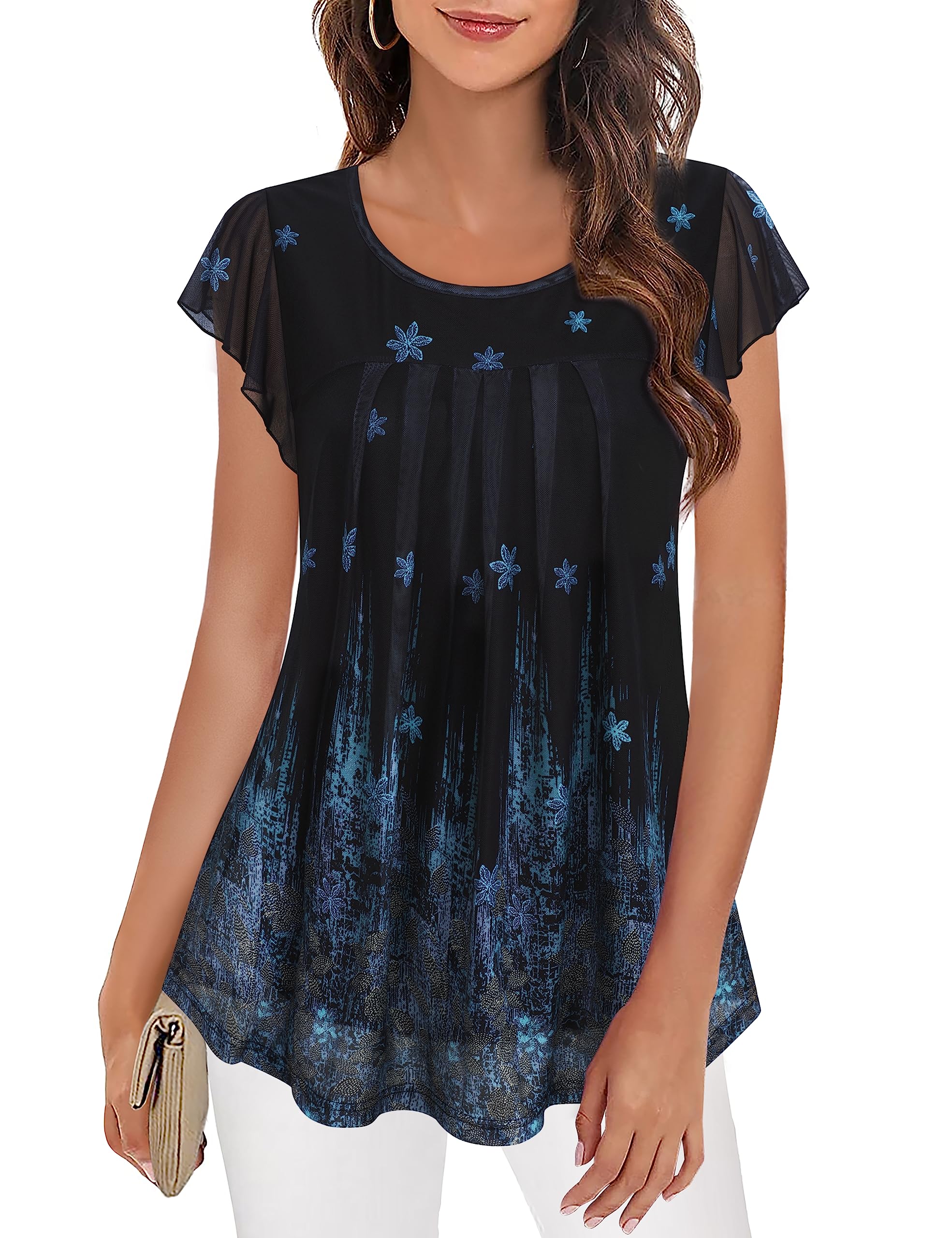 [Premium Material]:This women tunic blouse is made of very comfortable 95% polyester plus 5% spandex blend fabric which is lightweight,soft,breathable and stretchy [Features]:Short ruffle sleeve,round neckline,double layer (mesh outer layer and knitted lining),pleats in front,floral print,curved hem,loose fit style,women summer tops for work casual [Classic Round Neck Design]:Loose crew neck design shows off your slender neck.Pair with necklaces can effectively increase the sense of hierarchy.This summer pleated top design can cover your belly well and make you look slimmer,great for taking pictures. [Flattering Double Layer Design]:The ladies tunic blouse with two layers,it gives the illusion of tight and sexy with a pretty over shirt that keeps it elegant. [Flowying Ruffle Short Sleeve Design]:This tunic shirt for women has wiggle room because of the flowy ruffle sleeves.It can perfectly hide the arm fat,make you look more beautiful,sexy and graceful. [Collocation]:The women tunic top looks great with anything fitted on bottom,you can pair with skinny jeans,cute shorts,tighter skirt or leggings to complete a casual or professional look that's easy to love all season long. [Occasion]:The short sleeve tunic top is versatile for both dressy and casual occasions.Perfect for daily wear,at home,work,office,business,meeting,school,wedding,affternoon tea,interview,church,date,dinner,travel,holiday,beach tops,shopping,ect. [Wash Instruction]:Women mesh blouse is easy to care.Hand wash or Gentle machine wash in cold water/No bleach/Wash dark color separately/No need to iron.