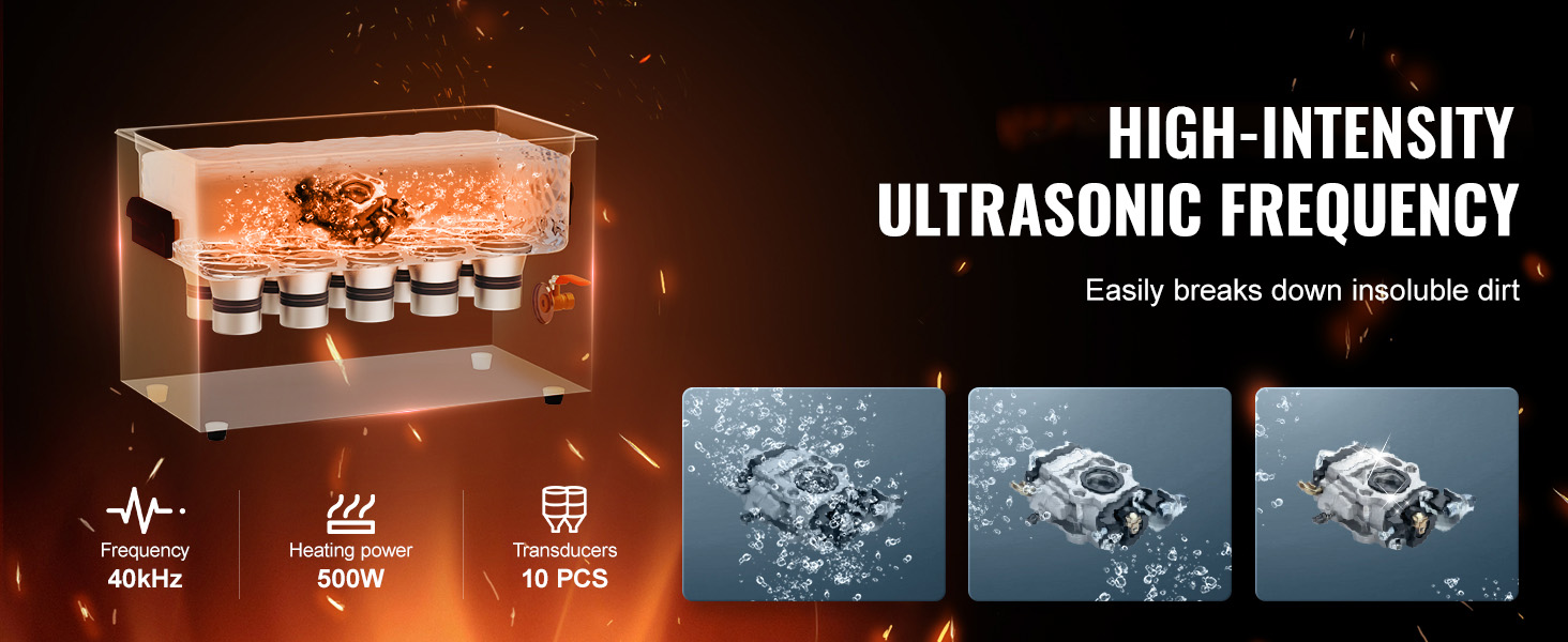 Powerful Cleaning Performance: The VEVOR Ultrasonic Cleaner operates at an ultra-high frequency of 40kHz, generating millions of tiny bubbles that explode in water, releasing strong cleaning energy. This energy penetrates every crevice, thoroughly removing stubborn stains from delicate parts, ensuring no area is left uncleaned.
