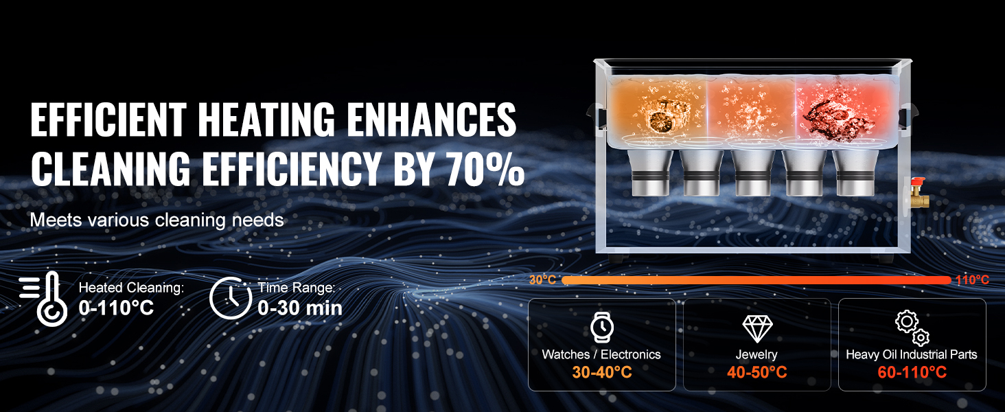 Heated Cleaning: For different items such as jewelry, watches/electronic accessories, and heavy grease industrial components, you can control the cleaning temperature from 0-110°C to accelerate the dissolution of dirt. This provides more efficient and targeted cleaning results. The high-temperature mode quickly breaks down stubborn grease, while the low-temperature mode gently protects sensitive materials.