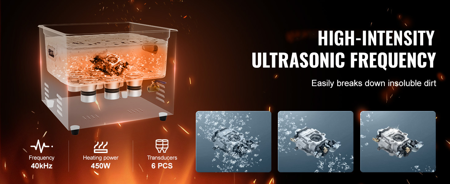 Powerful Cleaning Performance: The VEVOR Ultrasonic Cleaner operates at an ultra-high frequency of 40kHz, generating millions of tiny bubbles that explode in water, releasing strong cleaning energy. This energy penetrates every crevice, thoroughly removing stubborn stains from delicate parts, ensuring no area is left uncleaned.