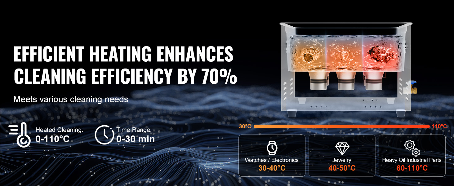 Heated Cleaning: For different items such as jewelry, watches/electronic accessories, and heavy grease industrial components, you can control the cleaning temperature from 0-110°C to accelerate the dissolution of dirt. This provides more efficient and targeted cleaning results. The high-temperature mode quickly breaks down stubborn grease, while the low-temperature mode gently protects sensitive materials.