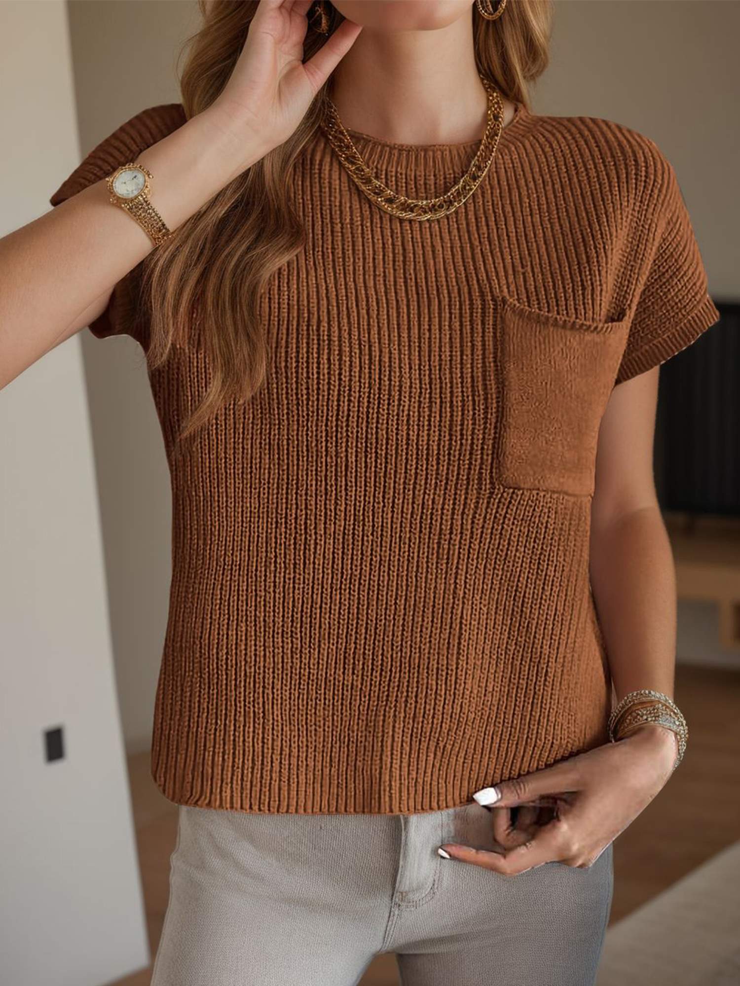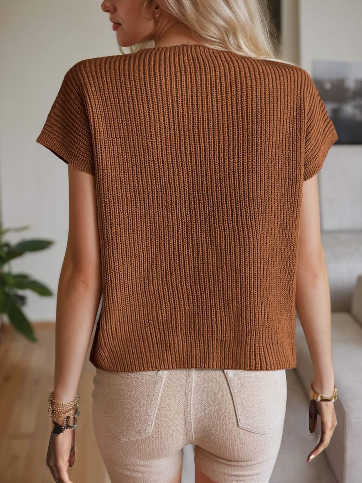 Cap sleeve ribbed knit sweater top pairs easily with jeans or skirts.