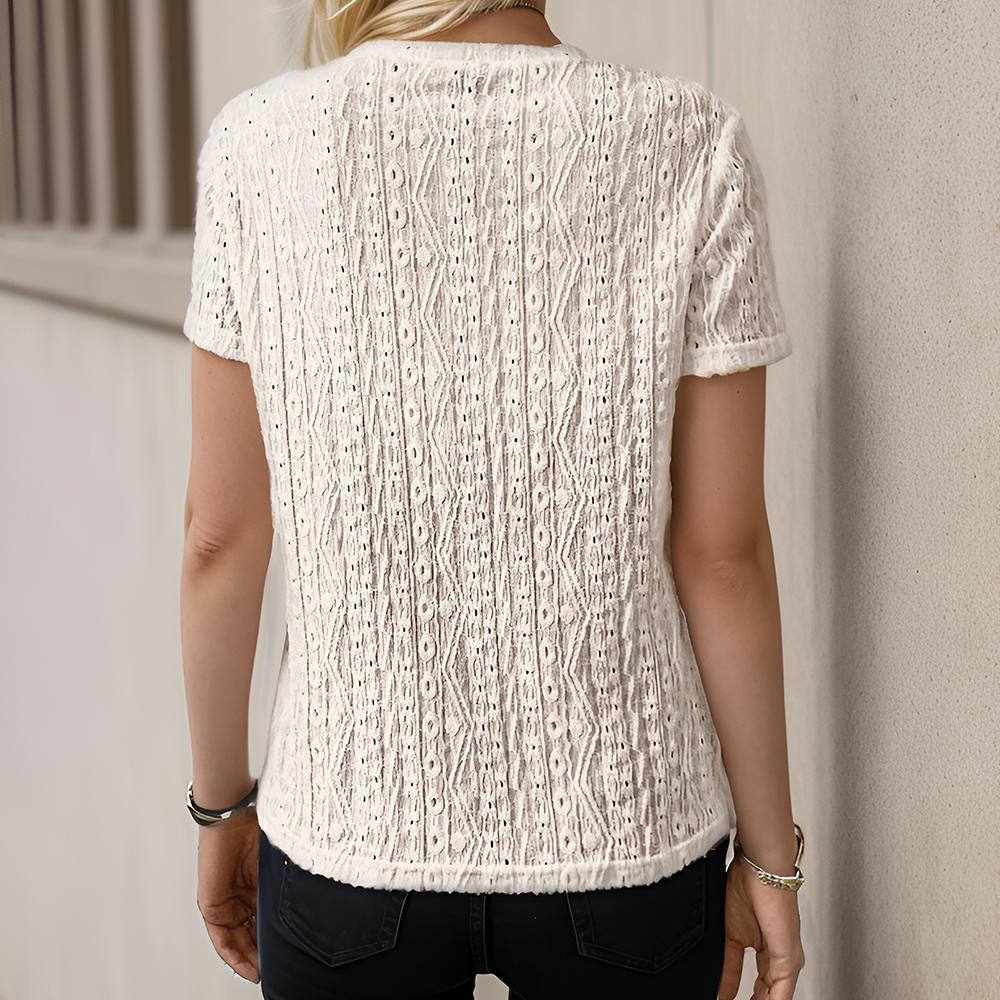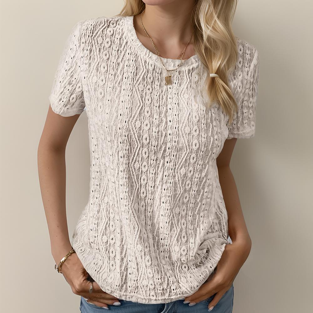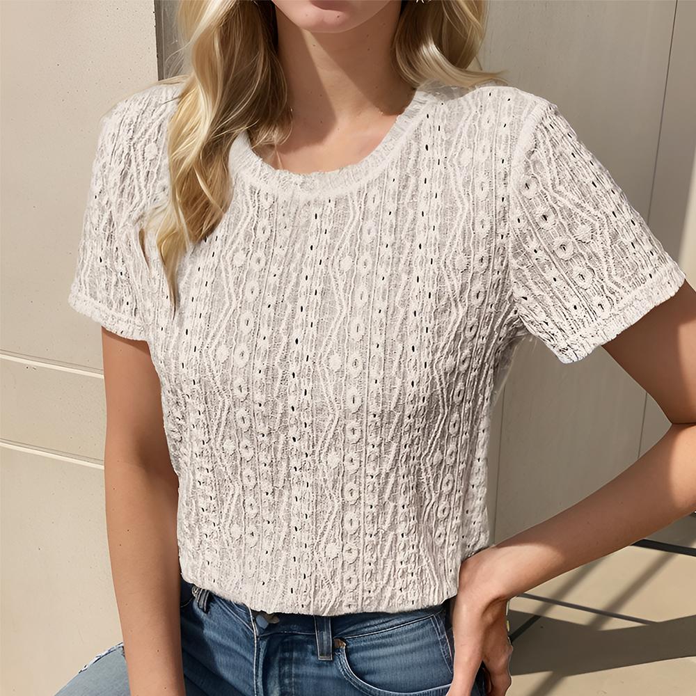 Women's Eyelet Embroidery Short Sleeve Tops Shirts Solid Crewneck Retro Plain Casual Holiday T-Shirts