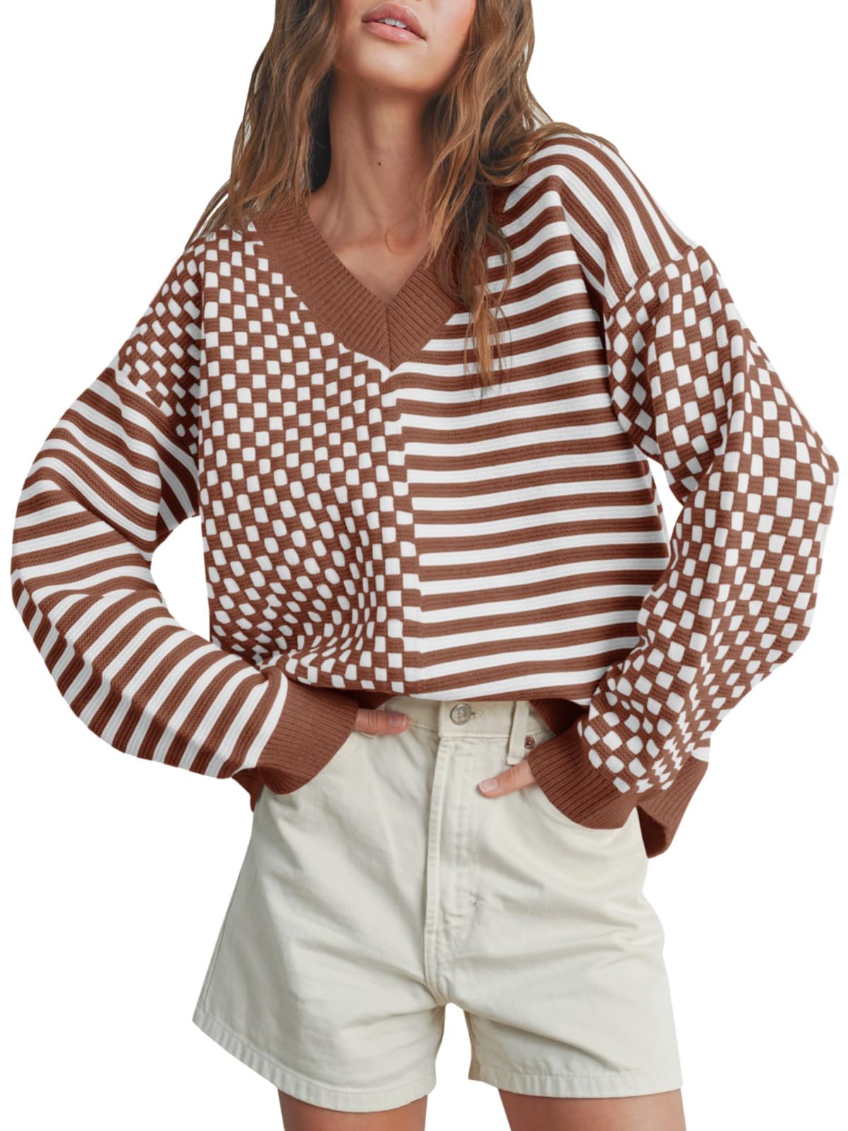 Womens Checkered Striped Sweater V Neck Long Sleeve Cozy Pullover Top Brown - L
