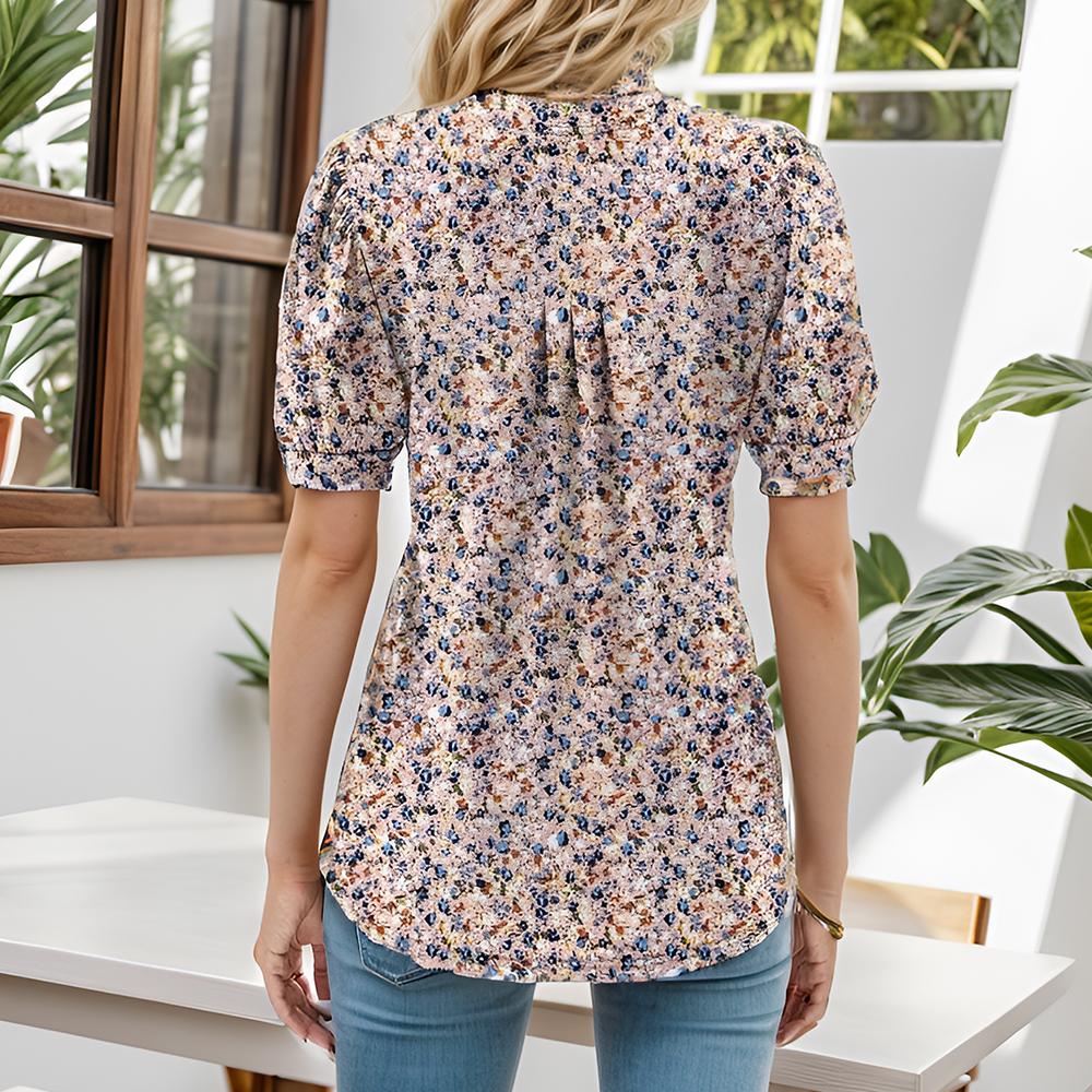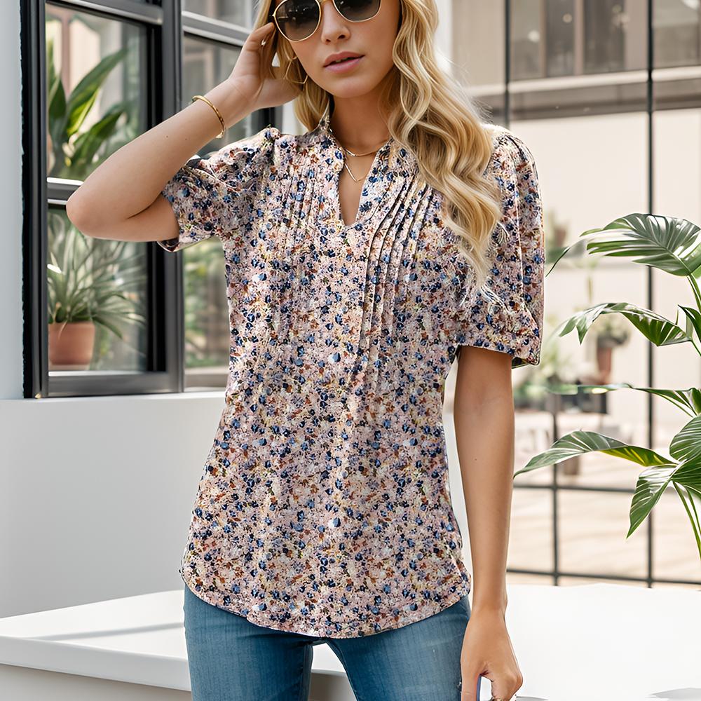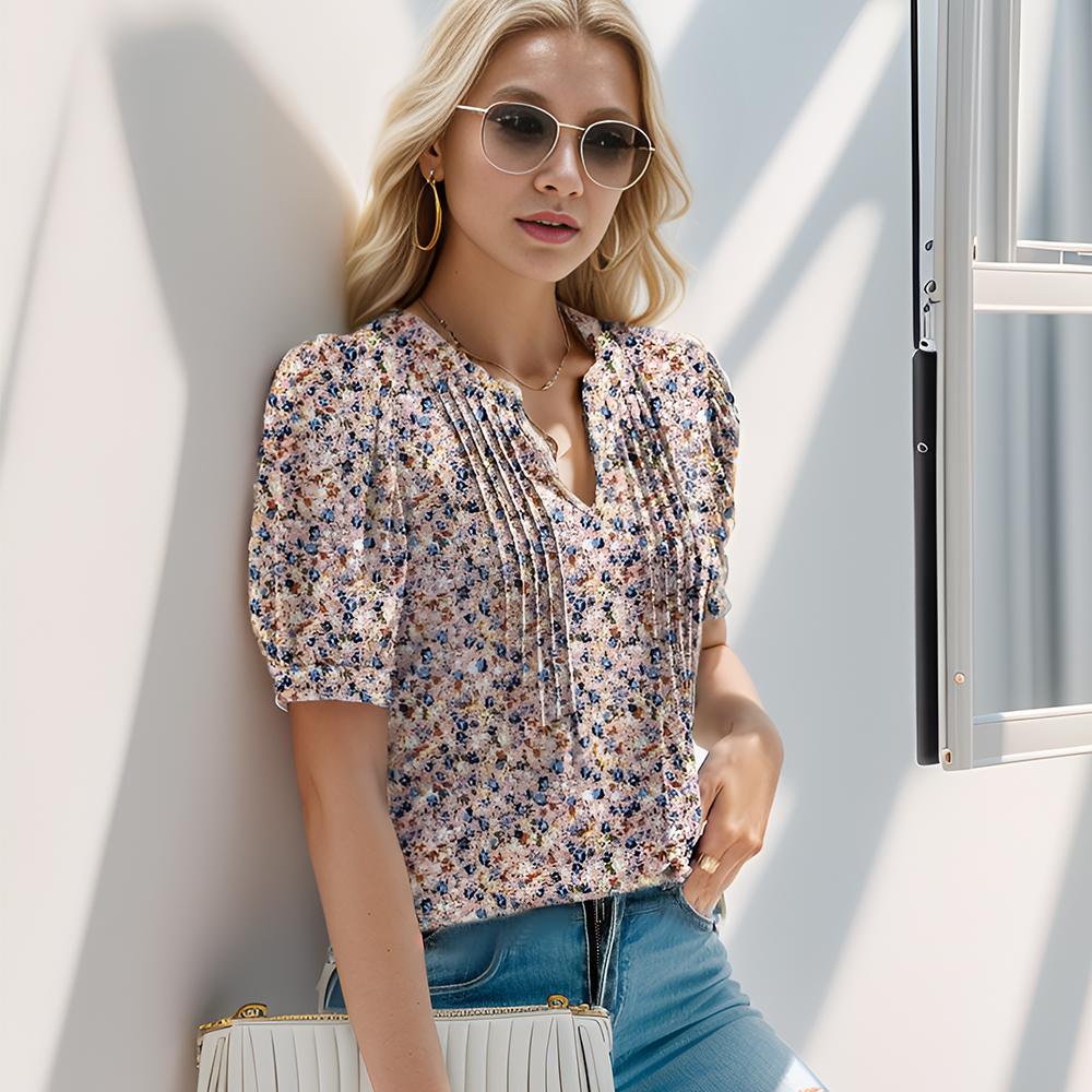 Womens V Neck Puff Short Sleeve Pleated T Shirts Fashion Summer Tops Casual Tunic Blouse