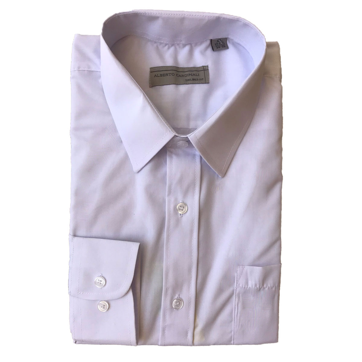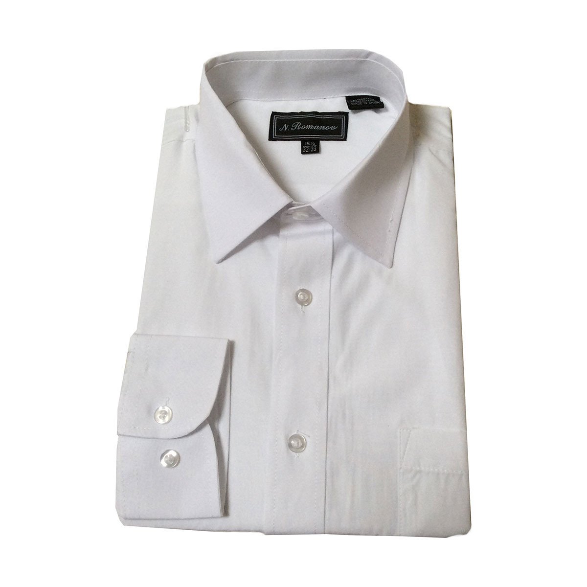 Mens plain white button up dress shirt with spread collar and pocket.