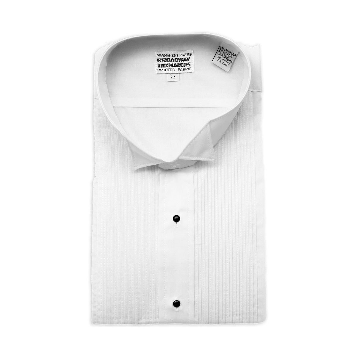 Women's white tuxedo shirt with wing collar is 65% polyester/35% cotton. It features 1/8" sewn down pintuck pleats and black studs. Cuffs may be buttoned, or fastened with cuff links (not included).