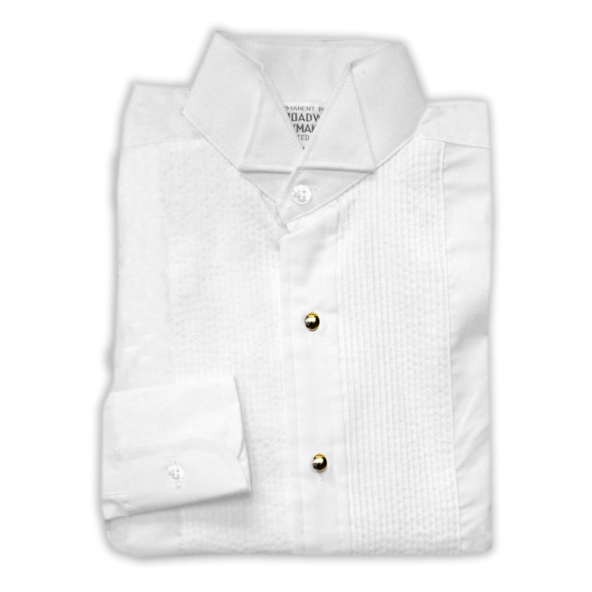 img{max-width:90%} Tuxedo Shirt, Girls, White, Wing Collar & 1/8" Pleat These young women's white tuxedo shirts with wing collar and stitched down 1/8" pintuck pleats are tailored to fit a slim figure. They include both black studs and white buttons and have buttoned cuffs that can also accommodate cuff links. Color: White Material: Poly/Cotton Collar: Wing Pleats: 1/8" Pintuck Customer service is our #1 priority. No questions asked 30 day return policy Don't see what you want? Send us a message & we'll try our best to help you out.