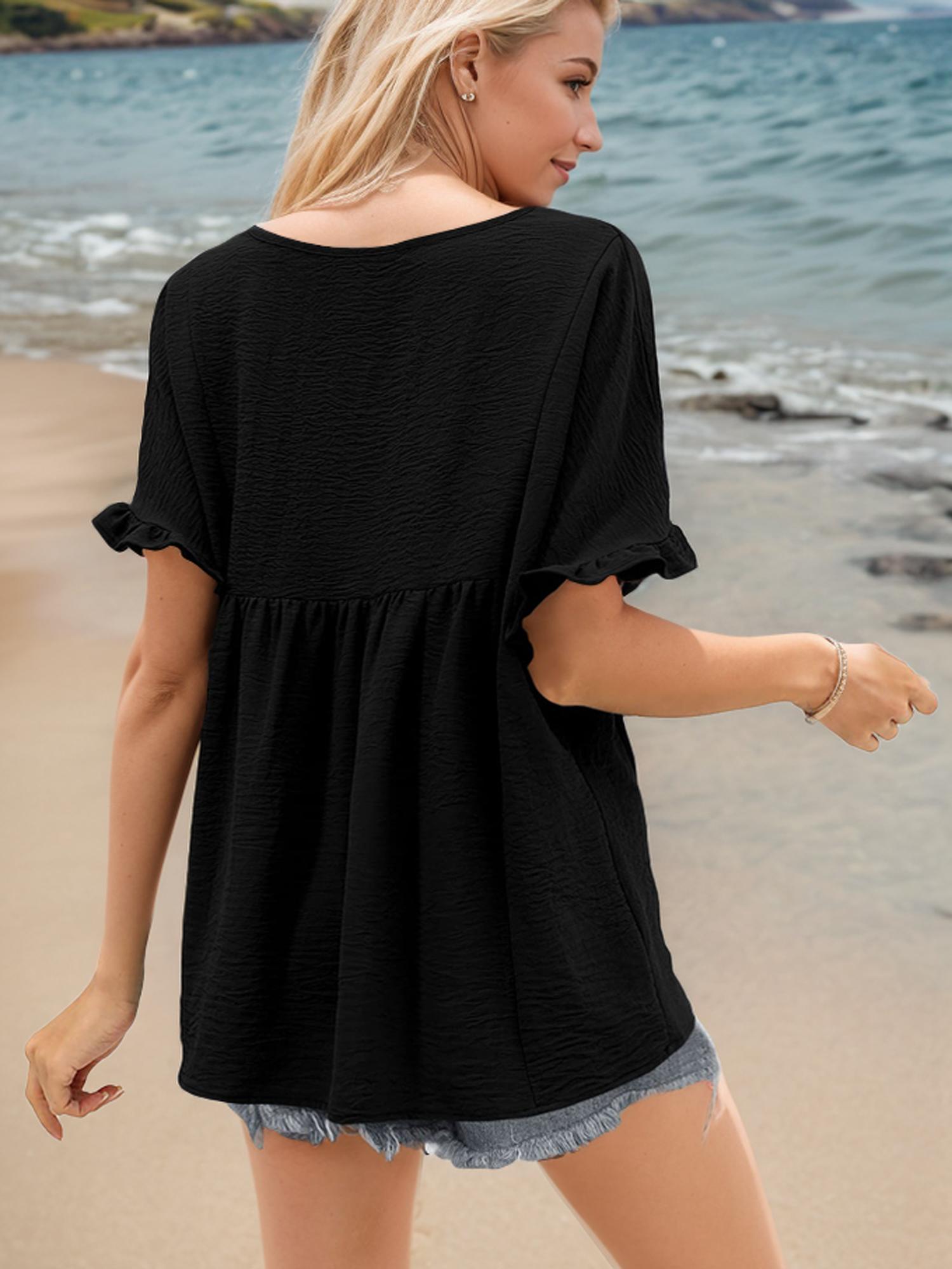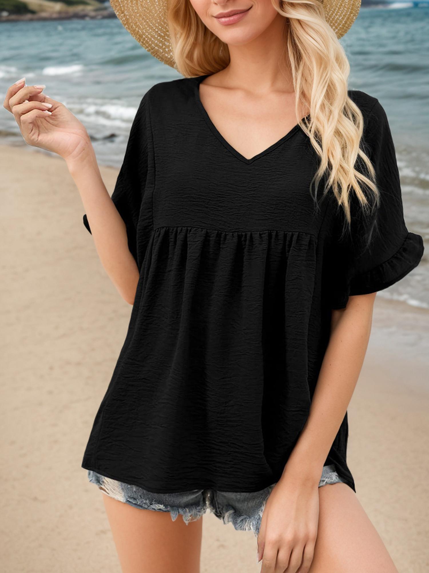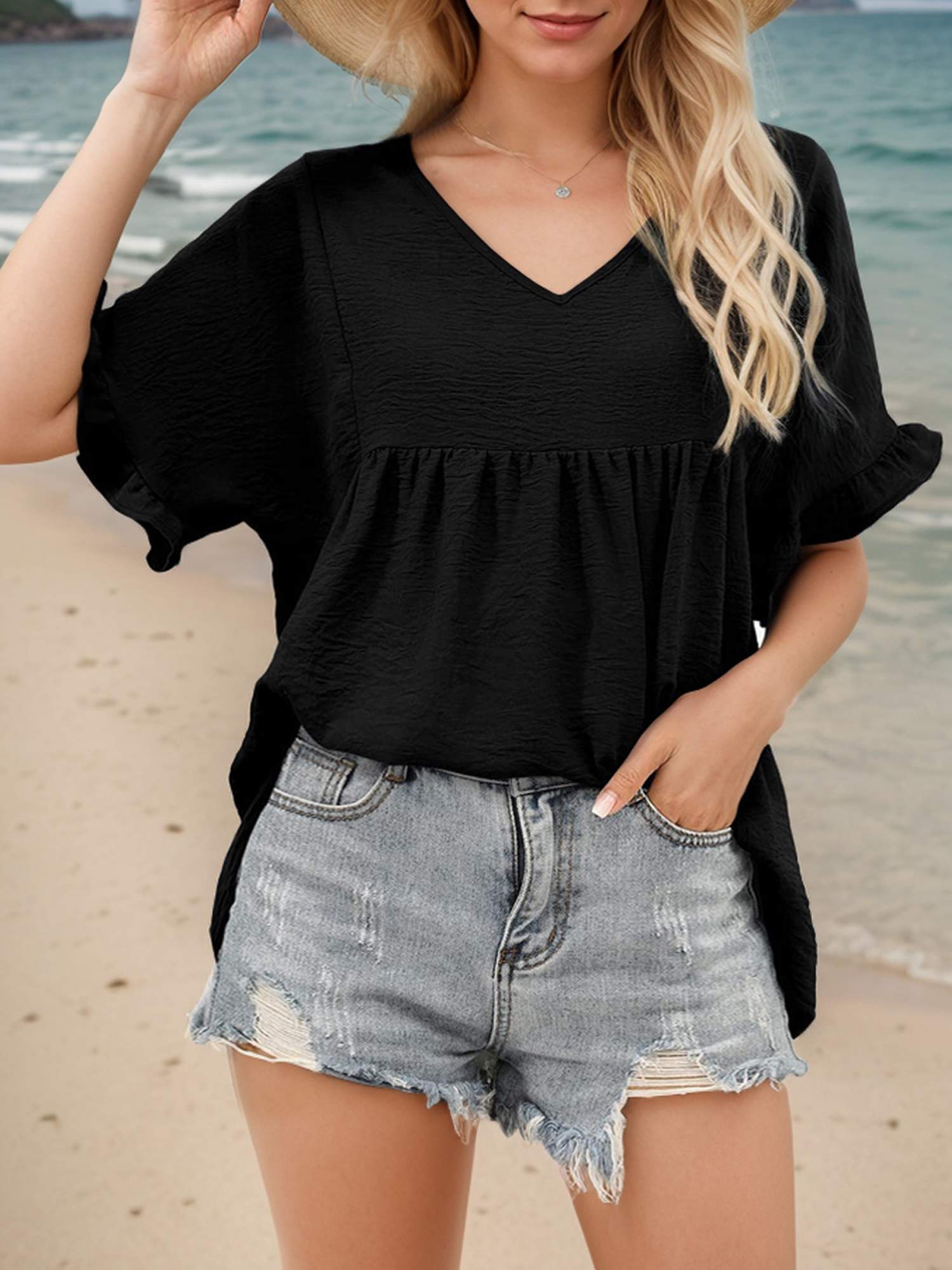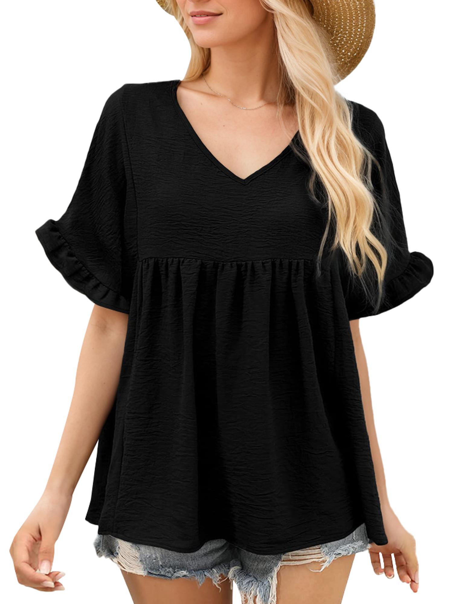 Feature: V Neck T-Shirts, Ruffle Sleeve Tops, Short Sleeve Flowy Blouses, Trendy Spring Babydoll Tops, Solid Color Summer Peplum Tops. Easy to Wear and Suitable for Any Age.