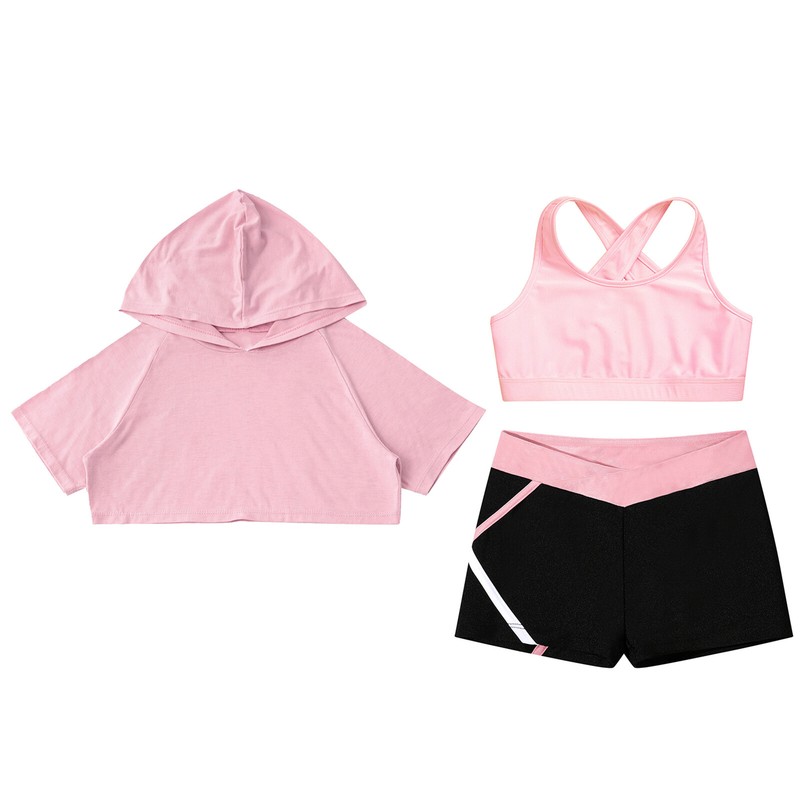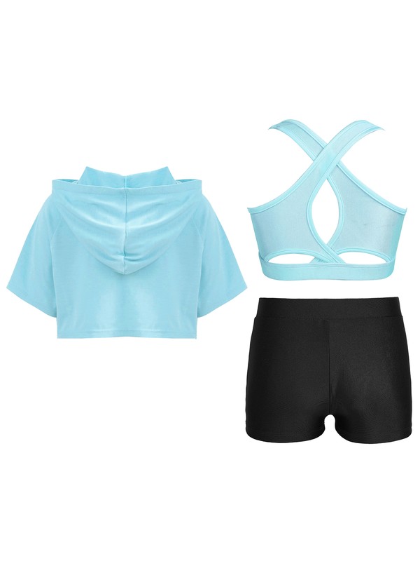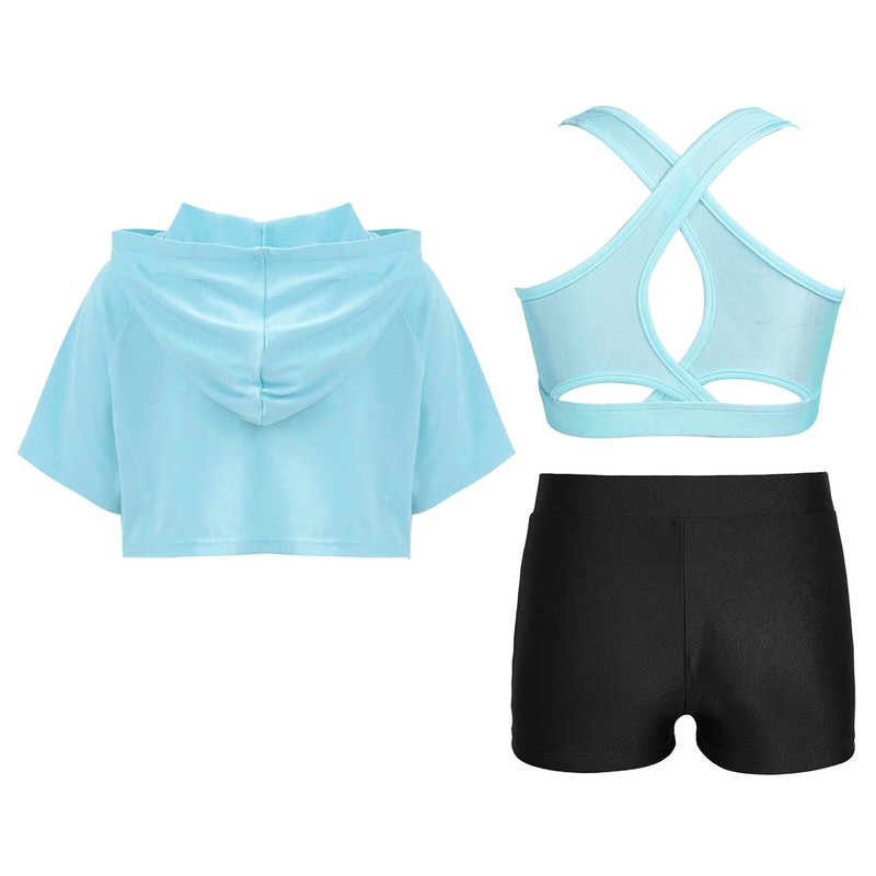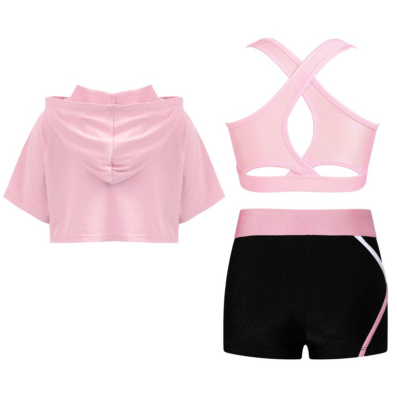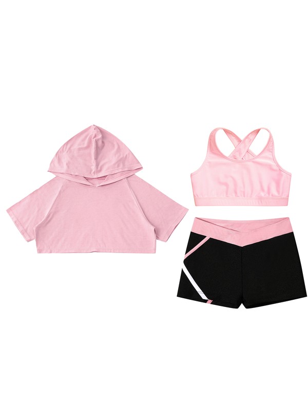 Short sleeve, crop top is designed with hood, pull on closure. Come with V-front waistband shorts.