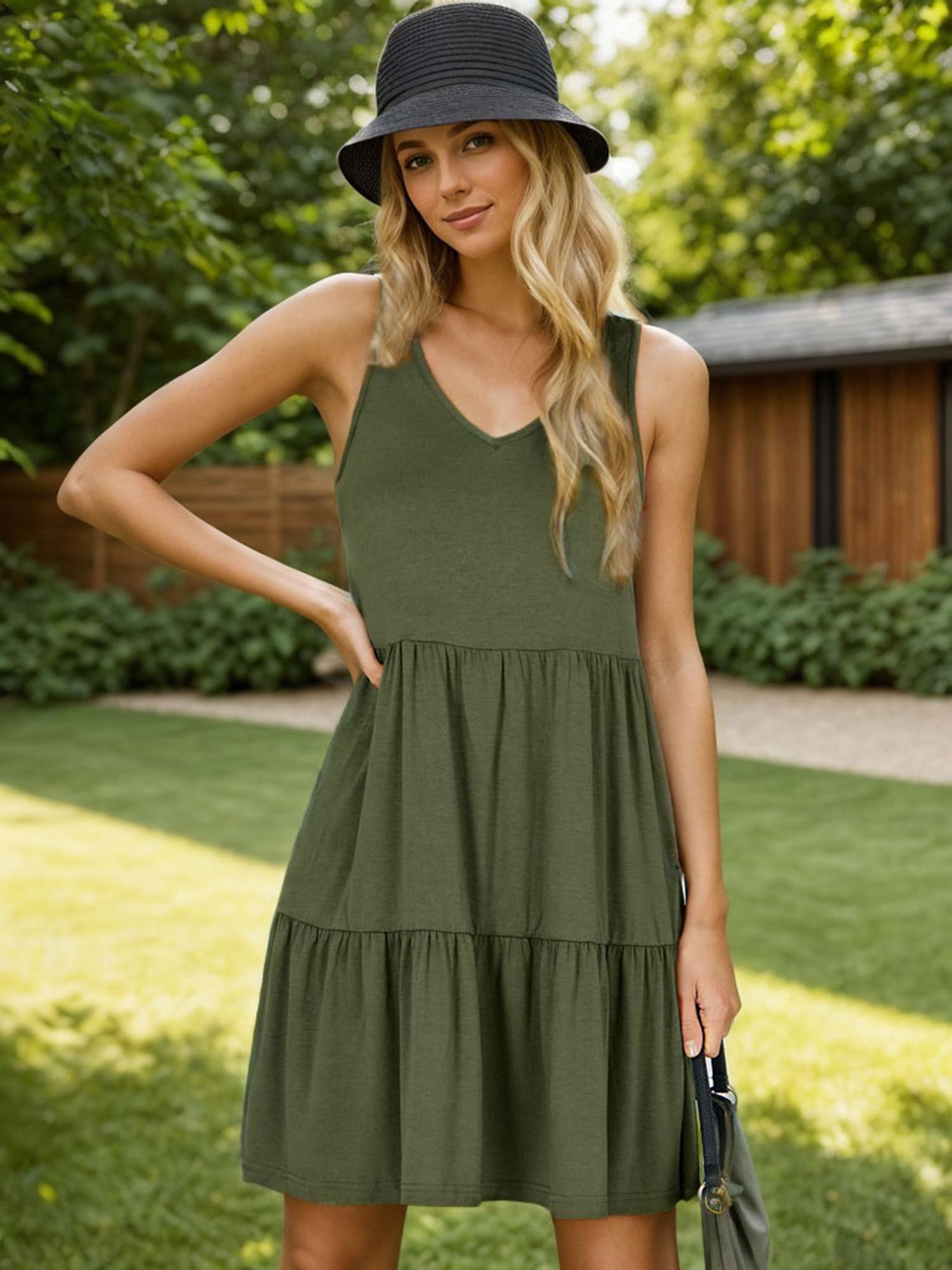 Sleeveless mini dress with deep V neckline, pleated and tiered, tunic length, solid color.