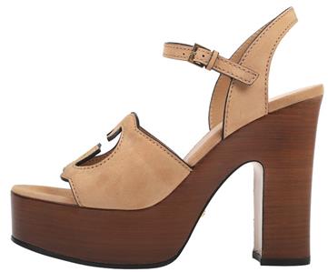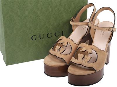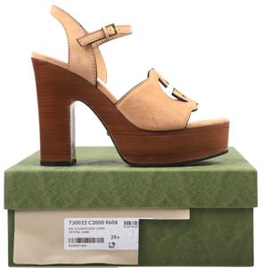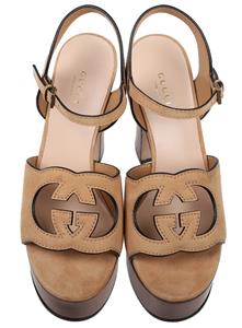 NEW IN BOX GUCCI LADIES SAND SUEDE LEATHER CUT OUT INTERLOCKING G LOGO SANDALS HEELS SHOES. MADE IN ITALY. 100% AUTHENTICITY GUARANTEED. LUXURIOUS QUALITY SANDALS IN SAND COLOR SUEDE LEATHER WITH CUT OUT INTERLOCKING G LOGO AT THE TOP. BLOCK LEELS, LEATHER LINING AND BOTTOM SOLE. 5" HEELS, 1.5" PLATFORM. SIZE 39.5, US 9.5