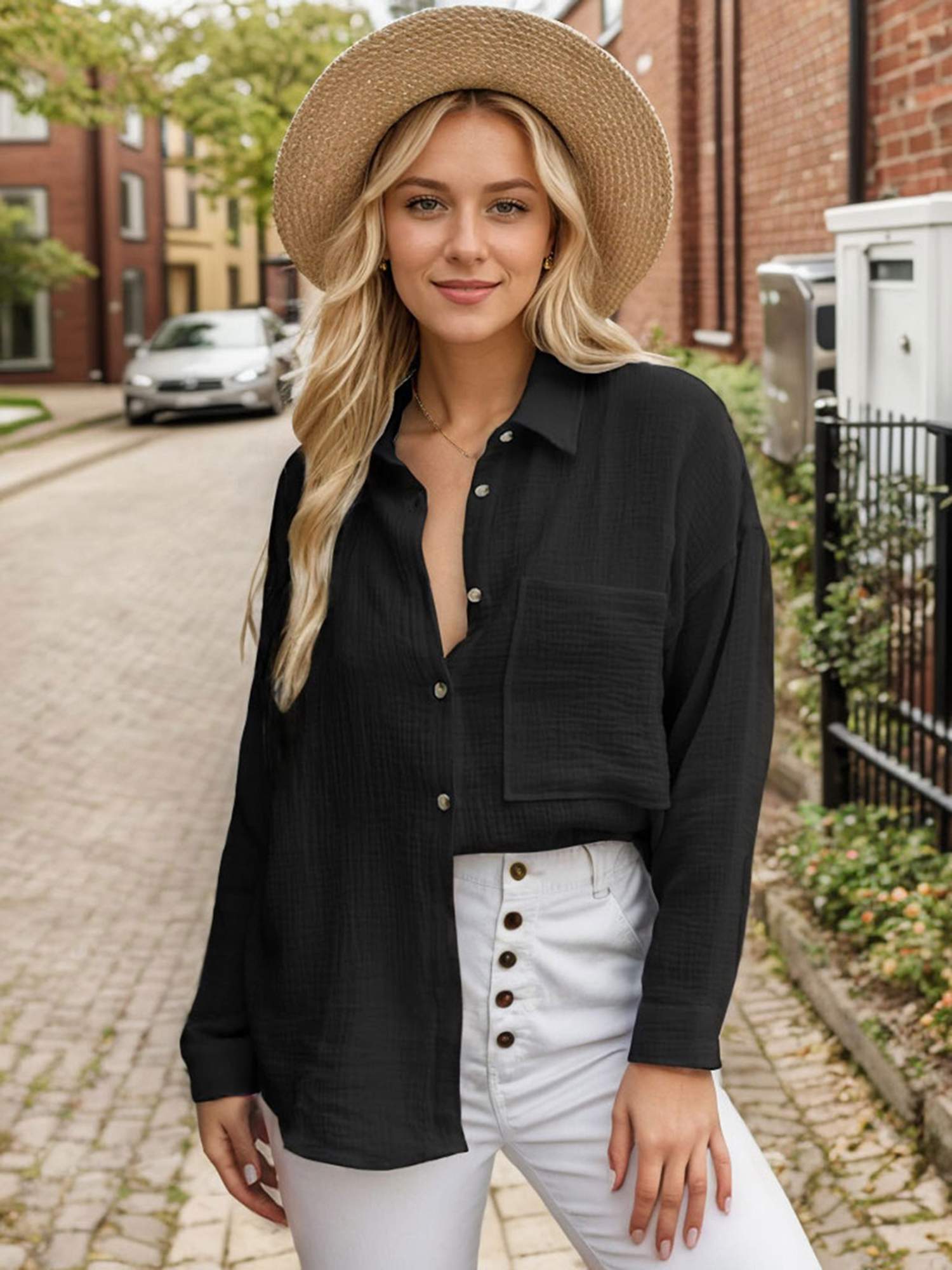 Womens Button Down Cotton Shirts Long Sleeve Oversized Tops with Pockets