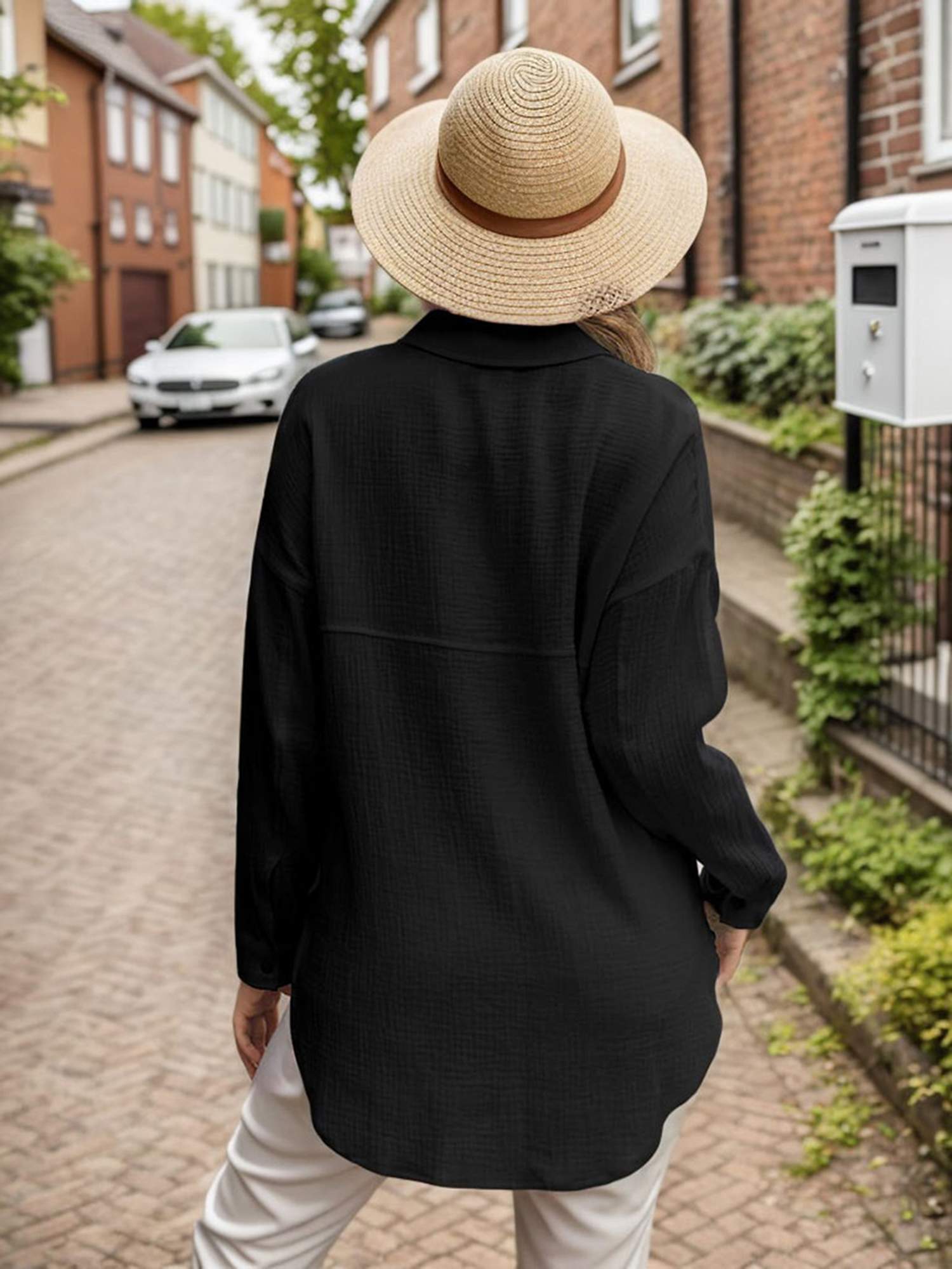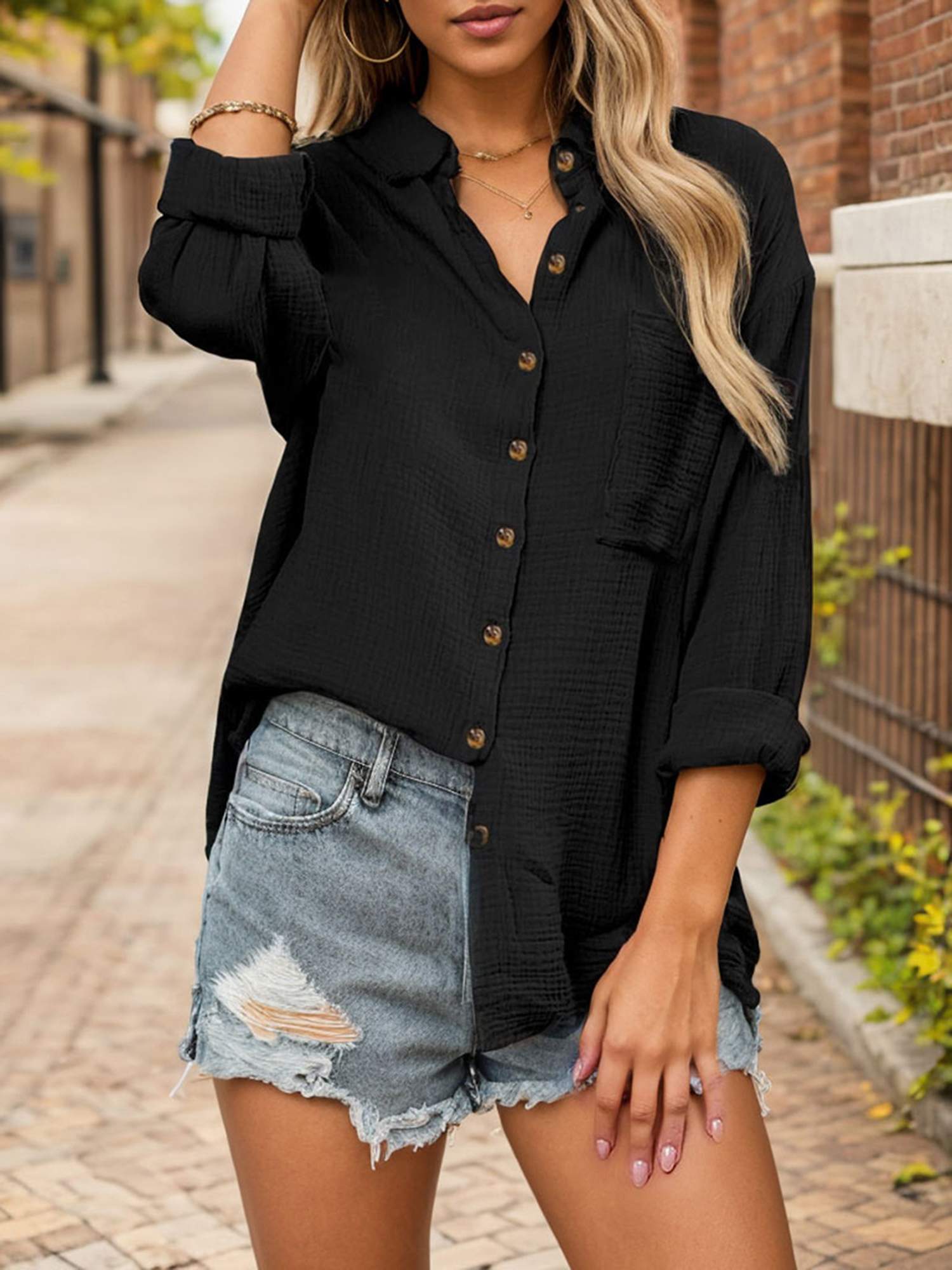 Soft cotton, lightweight, button-up, V-neck, long sleeves, relaxed fit, with a pocket.