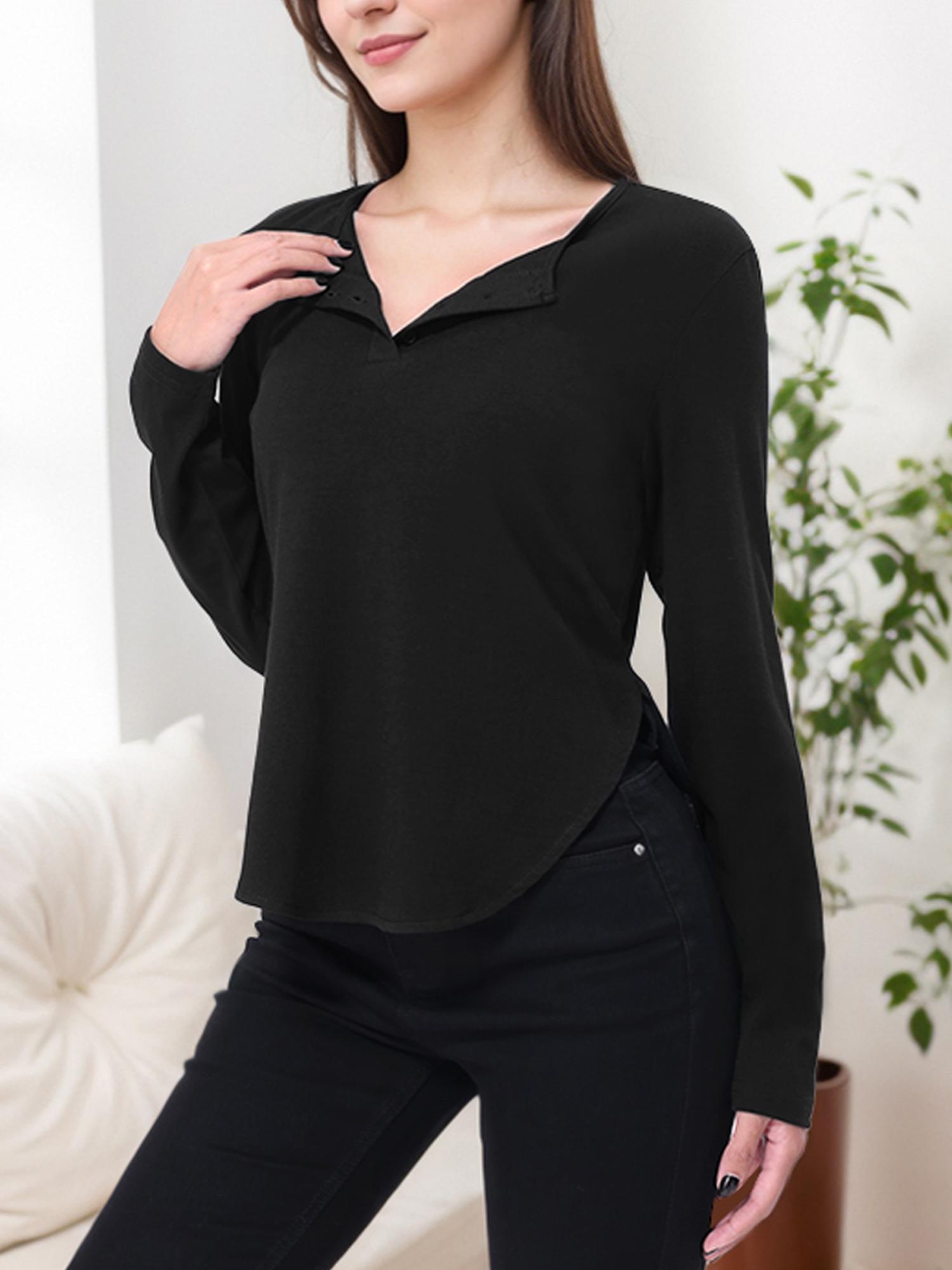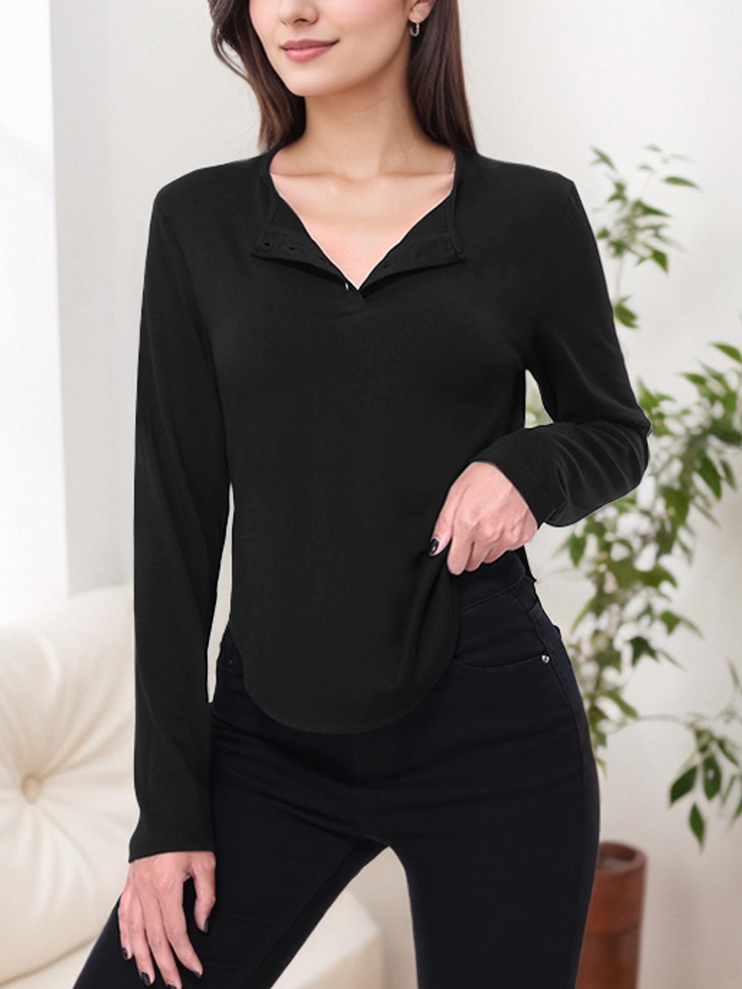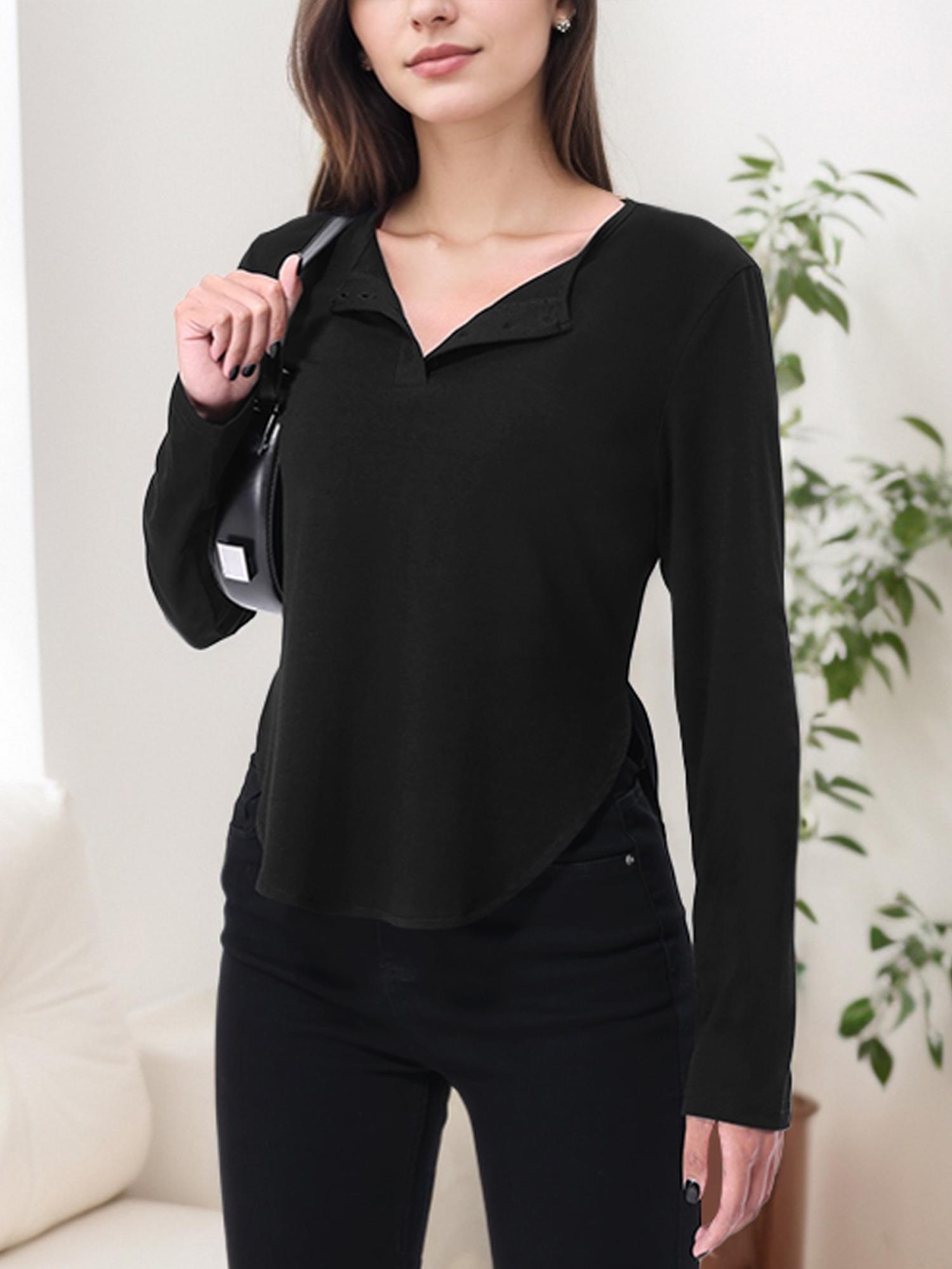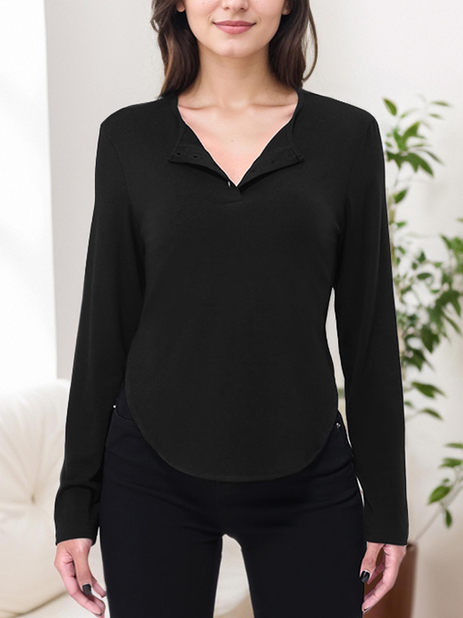 • Features a curved hem design with a v neck, long sleeves.