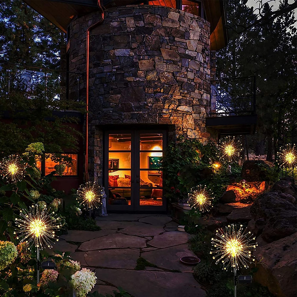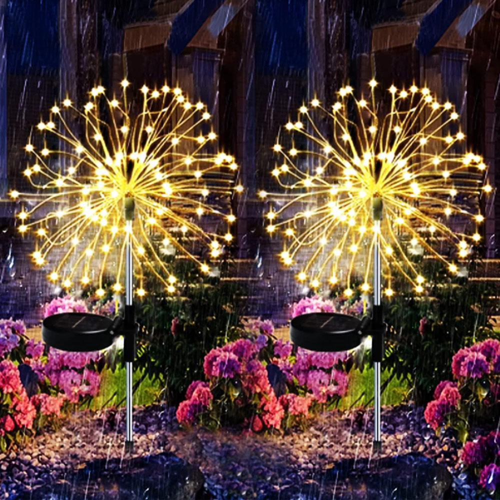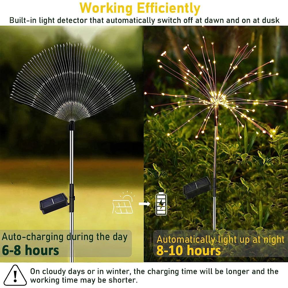 ?Upgrade 4er Pack Feuerwerkslichter? Im Vergleich zu anderen gewöhnlichen Starburst-Lichtern nehmen wir das neueste Design an? 1 Verwenden Sie ein Solarpanel mit großer Kapazität, um Strom für 4er-Pack Solarwegleuchten bereitzustellen, die nicht nur eine lange Arbeitszeit gewährleisten, sondern auch die Transportkosten senken, dass Sie 4 Packungen Solarleuchten für den Außenbereich zu einem niedrigeren Preis genießen können. 2 Erhöhen Sie die Feuerwerksglühbirne jeder Feuerwerksleuchte von 105 auf 120. 3 Erhöhen Sie die Beleuchtungsmodi von 2 auf 8. Diese schönen Gartenleuchten sollten Sie sich nicht entgehen lassen