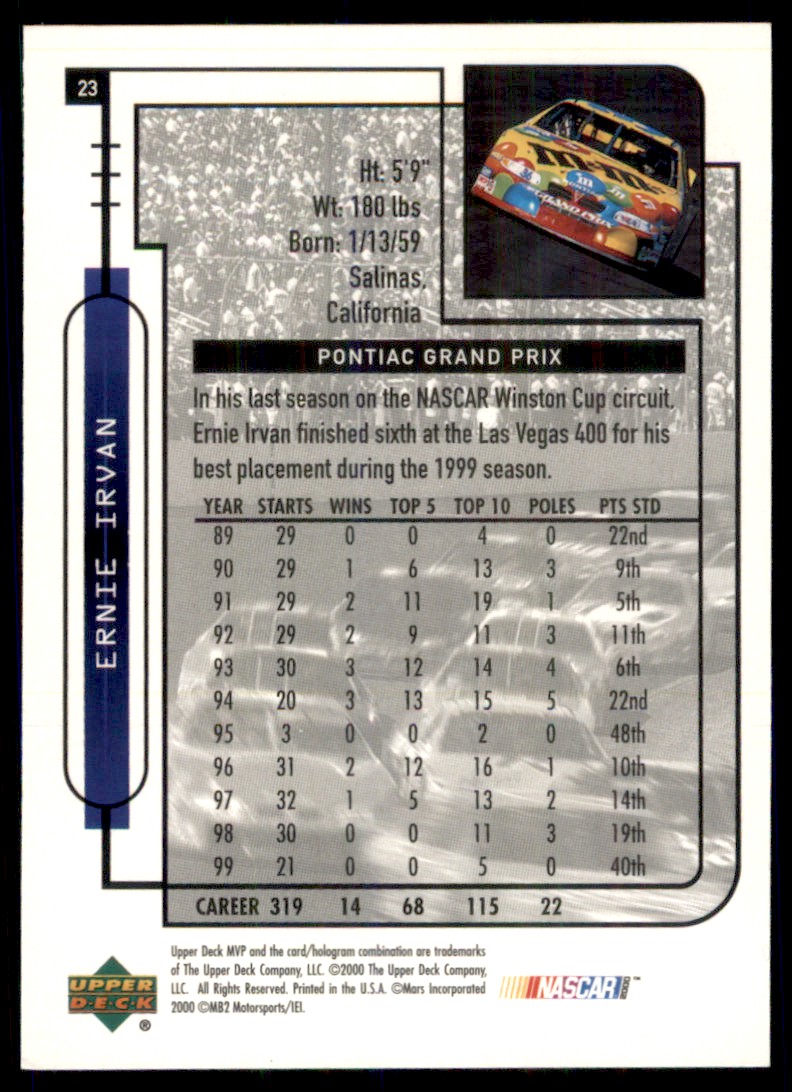 2000 Upper Deck MVP Ernie Irvan MB2 Motorsports #23