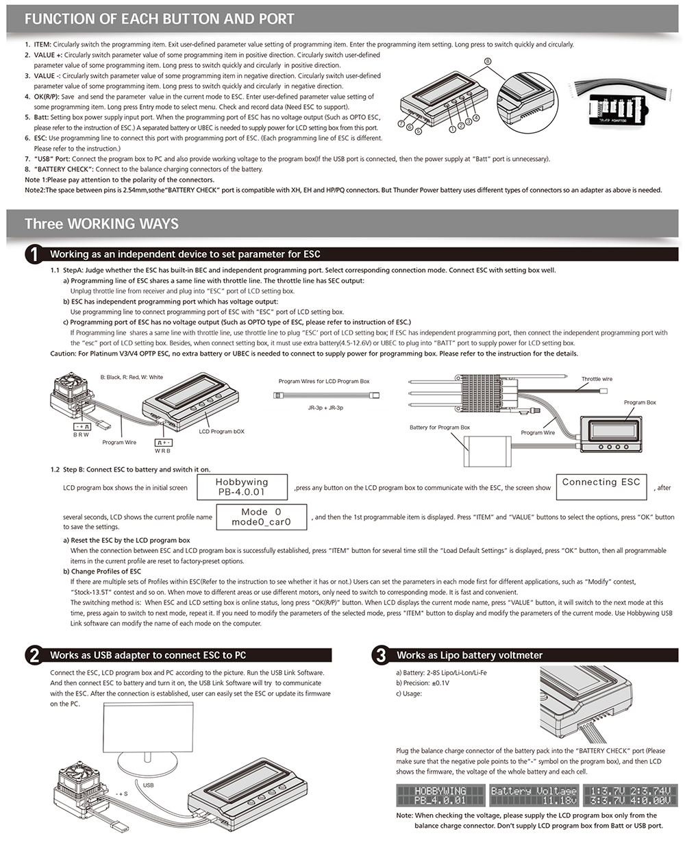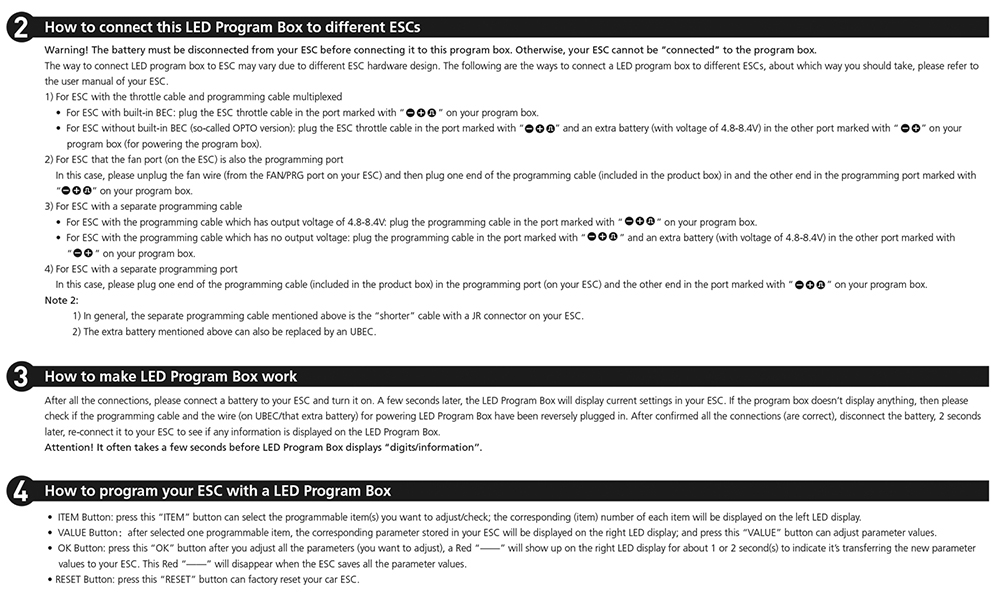 Eingangsspannung: 5–12,6 V (eine separate Batterie wird für die Stromversorgung dieser Programmbox benötigt, wenn ESC kein eingebautes/externes BEC hat)