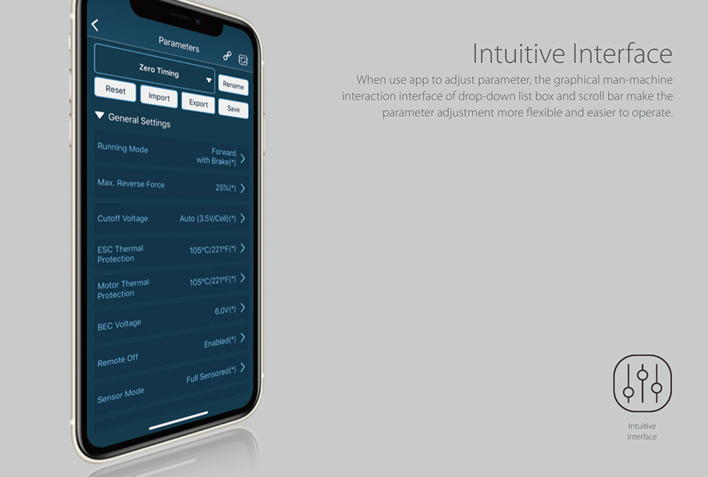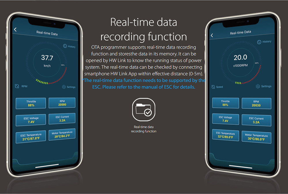 2.Drahtlose Verbindung: Der ESC ist über den OTA-Programmierer drahtlos mit dem Smartphone verbunden. Verwenden Sie die Hobbywing HW Link APP, um alle Parameter des ESC übersichtlich anzuzeigen und einzustellen. Die Schnittstelle ist einfach zu bedienen.Bluetooth-Übertragung und beeinträchtigt nicht das Netzwerk des Smartphones
