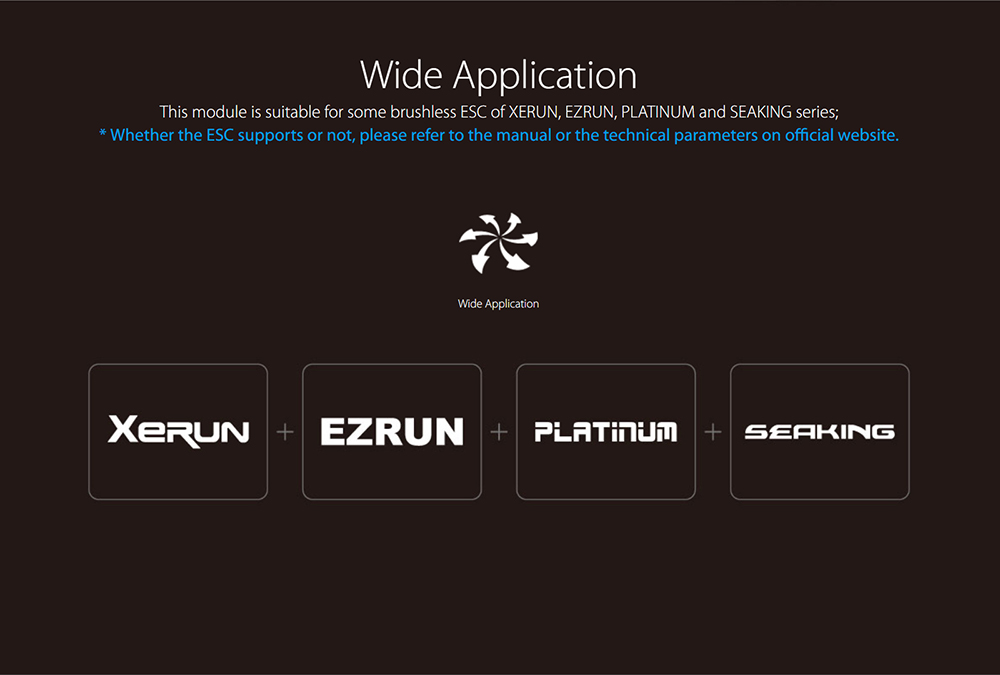 1.Breite Anwendung: Dieses Modul eignet sich für einige bürstenlose Regler der Serien XERUN, EZRUN, PLATINUM und SEAKING