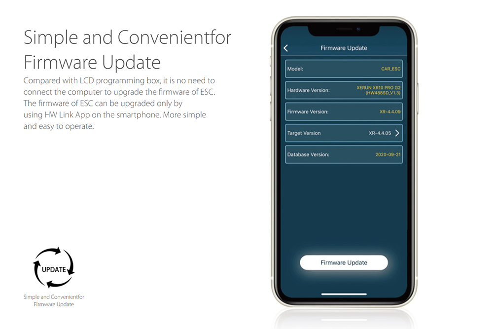 Die Firmware des ESC kann nur mit der HW Link App auf dem Smartphone aktualisiert werden. Einfacher