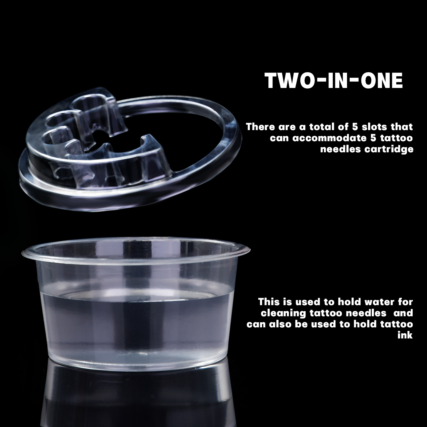 - Two in one design: We have designed this tattoo needle holder in two parts. The first function is to have 5 card slots on top, which are used to place tattoo cartridge needles and are suitable for most cartridge needles on the market. The second function is that the cup body can be used to hold clean water and tattoo ink, and these two parts can be disassembled and separated.