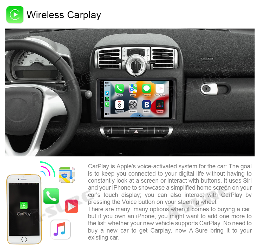 - Apple Carplay: wired or wireless Carplay in-vehicle system can closely integrate the user's iOS device and iOS experience with the dashboard system. Users who use wireless Carplay can connect to the car system via Bluetooth to realize voice-controlled navigation, make calls, send and receive messages, and listen to music. It is only available for iPhone