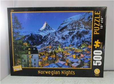 This is a NEW factory sealed box of ForeverClever "Norwegian Nights" 500 piece 19" x 14" puzzle.