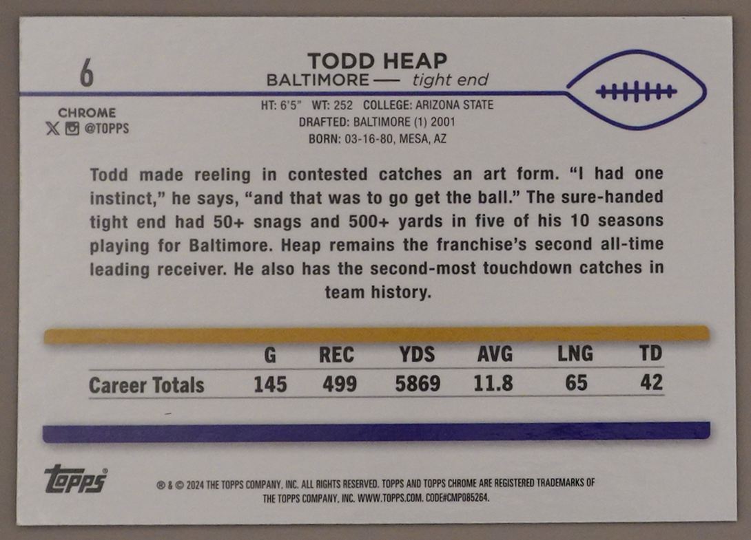 Todd Heap 2024 Topps Chrome Sapphire Baltimore Ravens #6