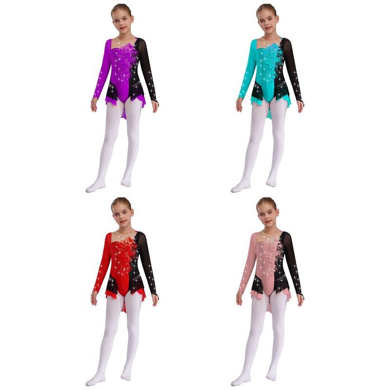 Kids Girls Leotard Sparkly Rompers Long Sleeve Unitard Performance Bodysuit TopUSD 17.99