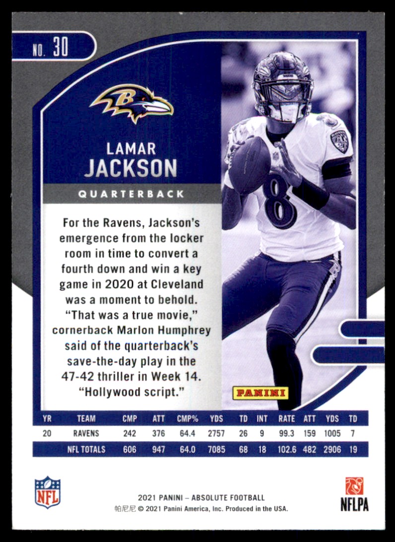 | 2021 Panini Absolute Lamar Jackson Baltimore Ravens #30 |