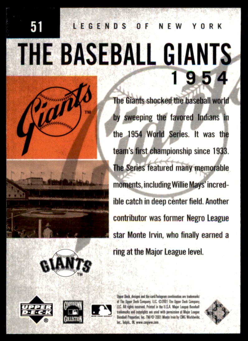 | 2001 Upper Deck Legends of New York 1954 Willie Mays New York Giants #51 |