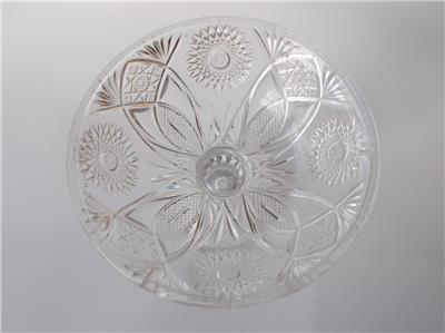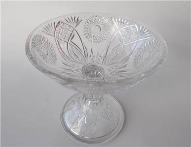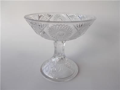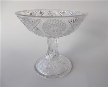 This is a beautiful antique pressed glass compote with starburst and fan designs. Measures 6" tall with a top 6 3/8" diameter.