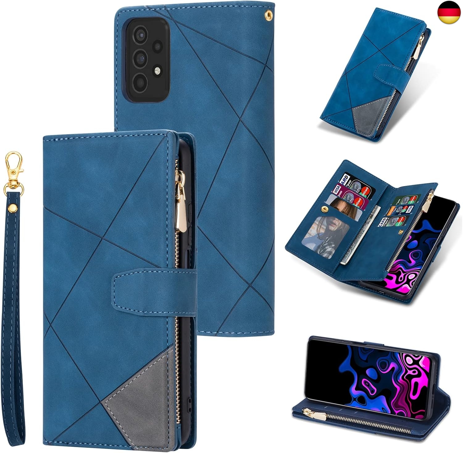 UEEBAI Hülle für Samsung Galaxy A53 5G, Retro Reißverschluss Handyhülle PU Leder Handytasche Bumper mit 9 Kartenfächer Standfunktion Geldbörse Trageband Schutzhülle Flip Wallet Case - Blau Raute