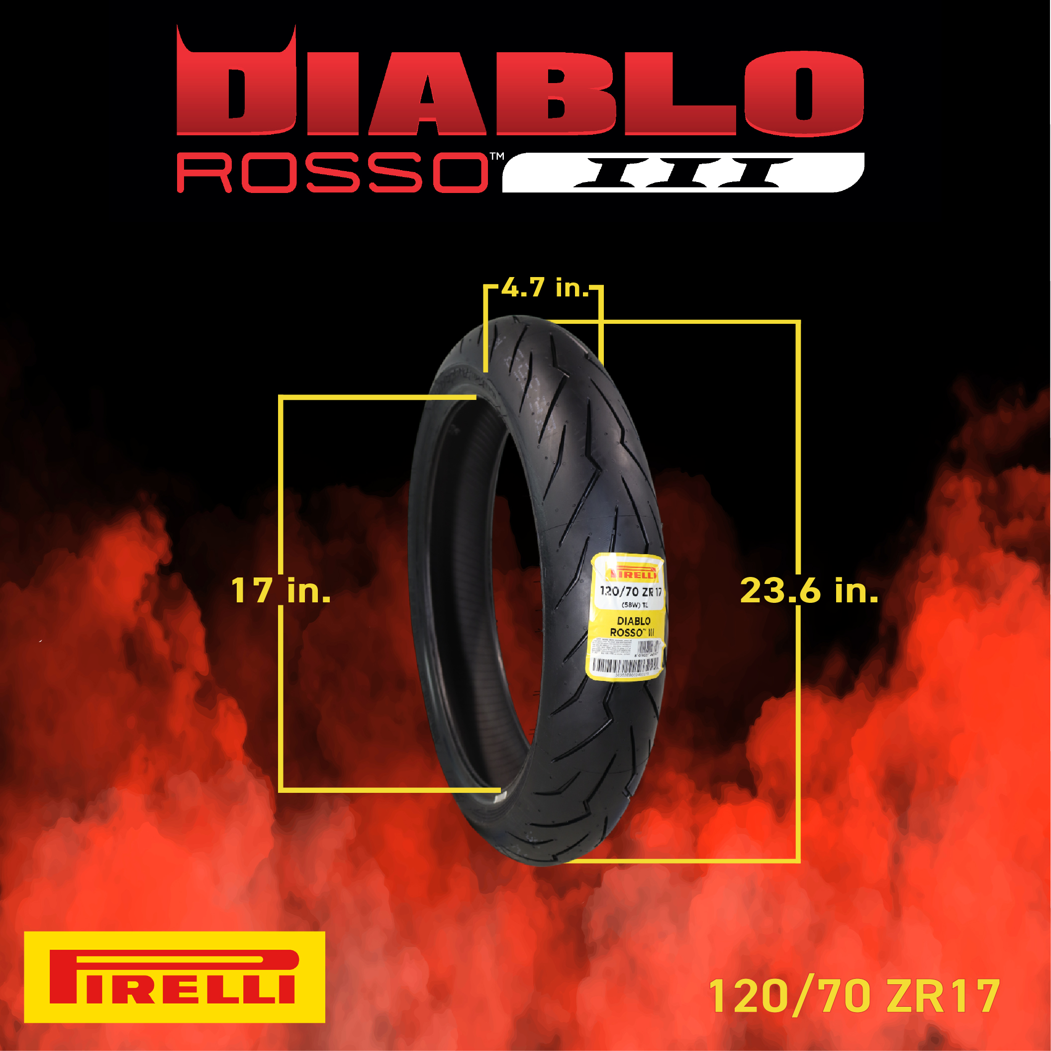 Introducing the DIABLO ROSSO™III, a motorcycle tire that offers unparalleled handling, absolute grip, and exceptional performance in wet conditions. Designed to provide lasting and consistent performance throughout the entire lifecycle of the tire, the DIABLO ROSSO™III is a great choice for riders who demand the very best in terms of safety and performance. Drawing inspiration from the highly regarded competition tire DIABLO™ Supercorsa, the DIABLO ROSSO™III features a tread pattern that is both distinctive and effective. The grooves on the tread are designed with a unique "flash" pattern, which not only adds to the tire's competitive edge but also helps to disperse water, making it an extremely safe and high-performance tire in wet conditions. As a testament to the excellence of the Pirelli brand in the motorcycle tire industry, the DIABLO™ represents 13 years of experience, technology, and victories in prestigious tests and competitions. It is no wonder that top bike manufacturers consistently choose the DIABLO™ as original equipment, and that all Diablo-marked products are considered a reference by the most acclaimed international magazines. In summary, the DIABLO ROSSO™III is a tire that offers exceptional handling, absolute grip, and outstanding performance in wet conditions. With its unique tread pattern and proven track record of excellence, the Diablo Rosso 3 is the perfect choice for riders who demand the absolute best in terms of safety and performance.| SIZE | 120/70-17 190/50-17 |