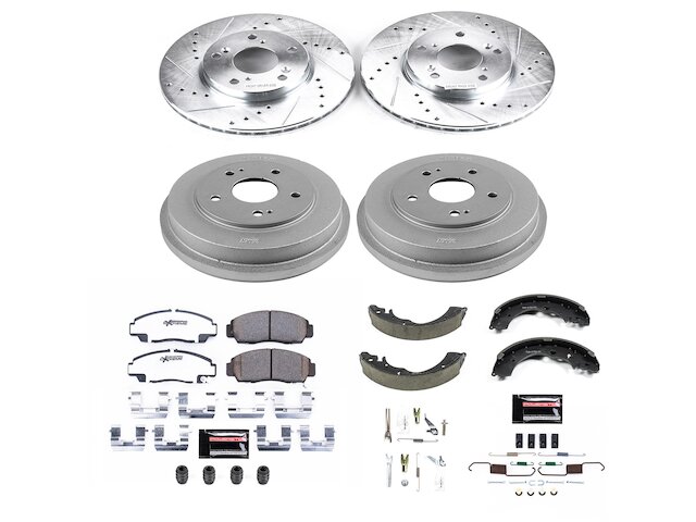 - This complete front and rear kit includes front drilled & slotted rotors with Z26 Street Warrior brake pads along with silver painted rear drums with brake shoes and hold down hardware.
