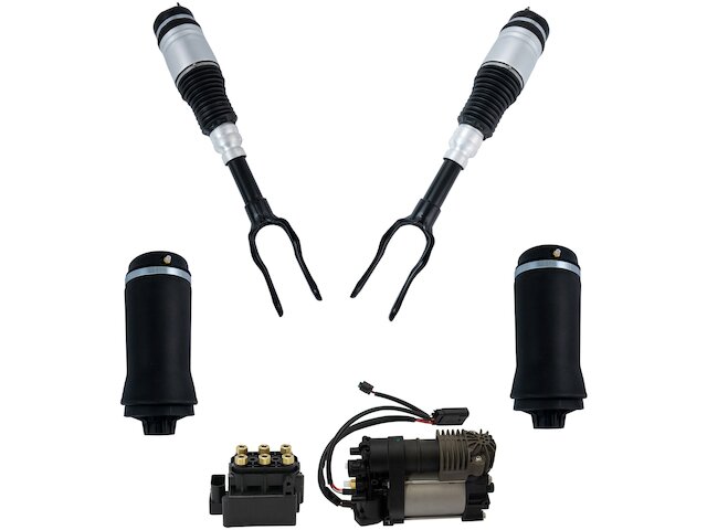 Package Contents: (1) Air Suspension Valve Block; (1) Air Ride Suspension Compressor; (2) Air Springs; (2) Air Shocks