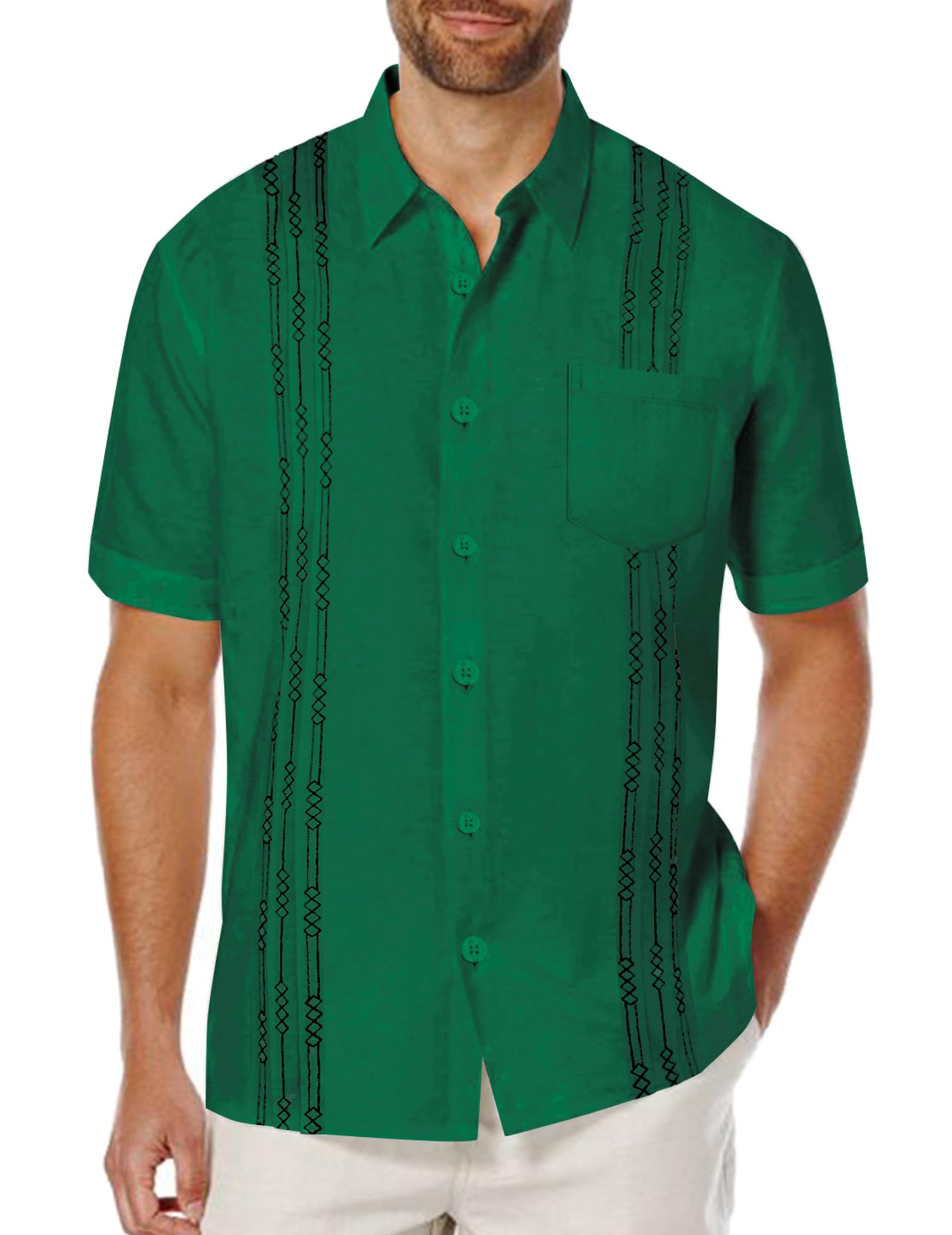 COOFANDY Men Casual Short Sleeve Button Down Shirts Cotton Linen Shirts Embroidered Cuban Guayabera Turn-down Collar Shirt Holiday Summer Beach Wear Top