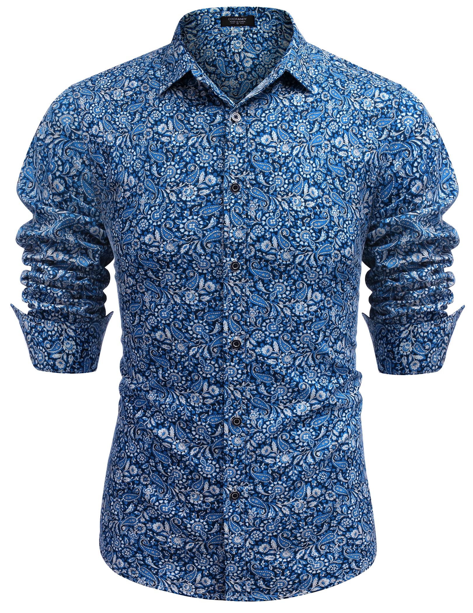 Men Dress Shirt Long Sleeve Floral Print Button Down Shirt(blue pattern, L)