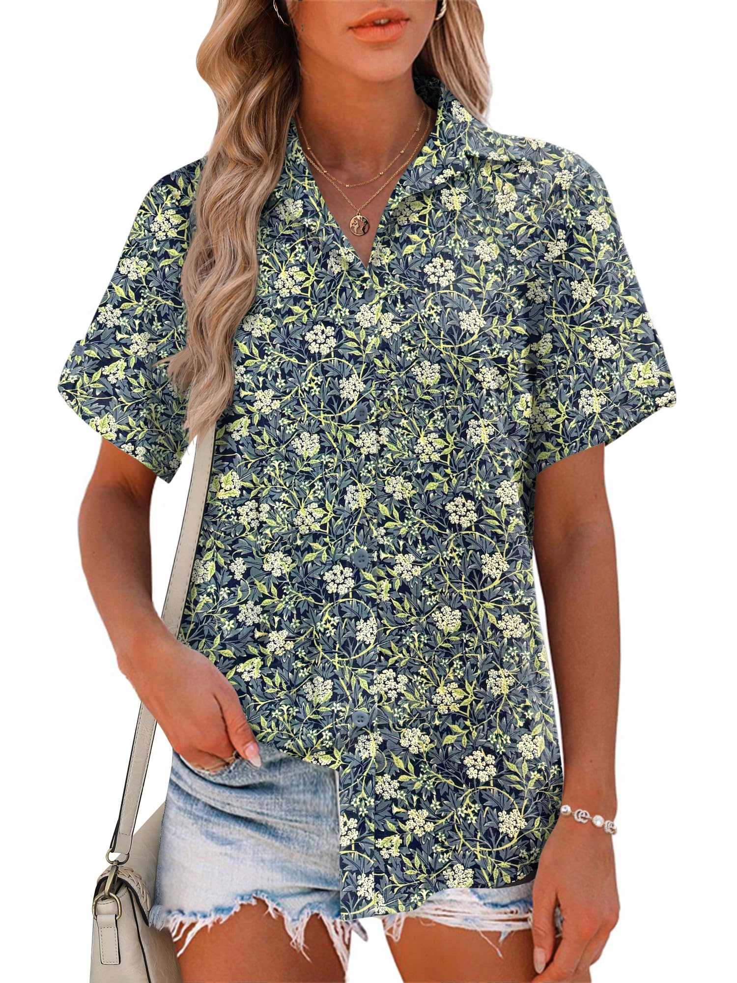 Women's Button-Down Cotton Short Sleeve Blouse V Neck Collared Button Up Large