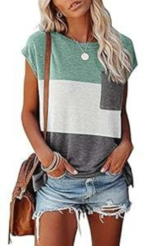Design: Womens summer tops 2043,round neck, solid color, three color block Fashion design.classic crewneck, basic tunic tee, Chest pocket for easy storage of small items, casual style suitable for all seasons.