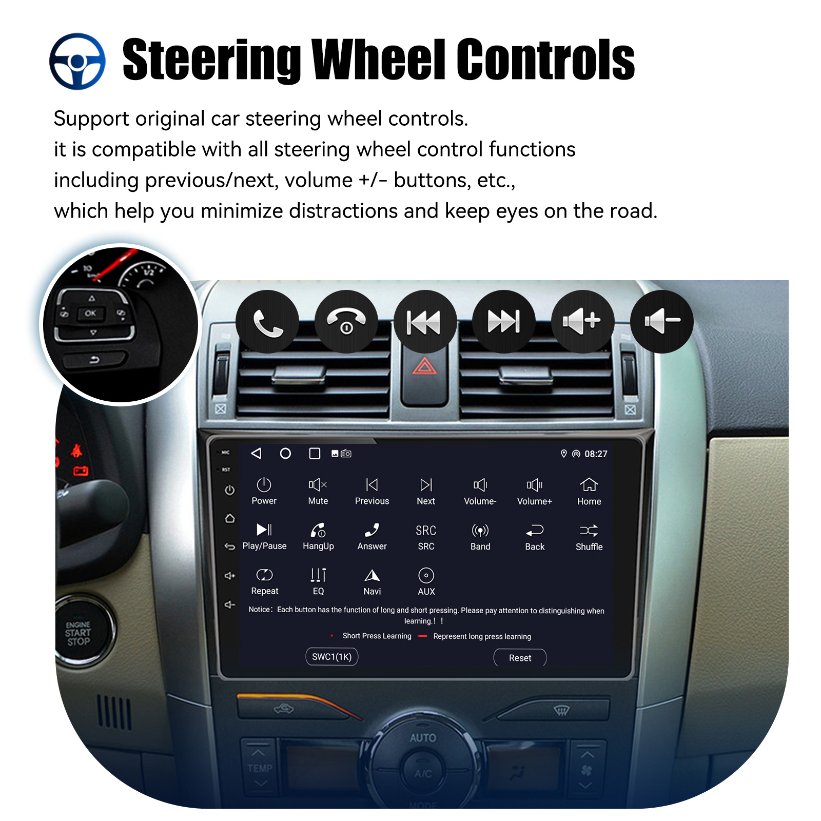 AHD Rear View Camera Input & Steering Wheel Control: After connecting to the rear view camera. The radio automatically displays the reversing image as soon as you engage reverse gear. Make your daily reversing safer. Support AHD camera. Support original car steering wheel control to make driving more convenient and safer