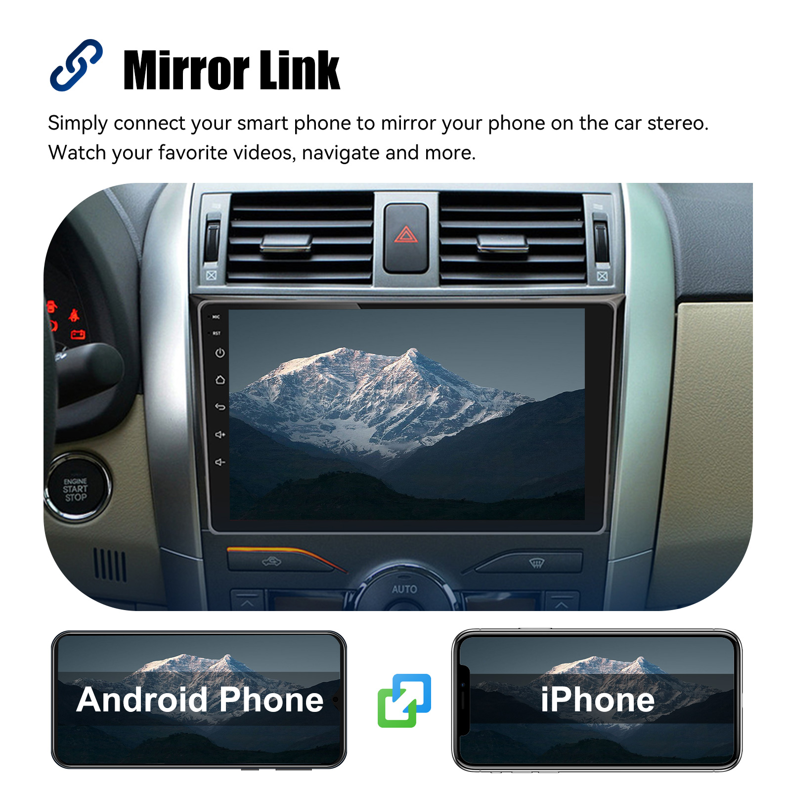 MIRROR LINK & APPLE CARPLAY & ANDROID AUTO: With this car radio, you can experience the amazing Mirror Link function, compatible with iOS and Android phones. You can mirror your smartphone screen to the car radio using apps like Google Maps, Spotify, Youtube, etc. Replace your cell phone with the car screen and turn your vehicle into a smart platform. Immerse yourself in a seamless and user-friendly infotainment experience with Apple CarPlay & Android Auto. Connect your iPhone to Apple CarPlay or your Android smartphone to Android Auto and securely access calls, texts, navigation, music and more. With intuitive operation via the touchscreen or voice control, you have all functions at your fingertips while you remain safely at the wheel. Use your favorite apps and stay connected at all times while keeping your eyes on the road. Turn your vehicle into an extended hub for your mobile devices and experience a new dimension in infotainment.