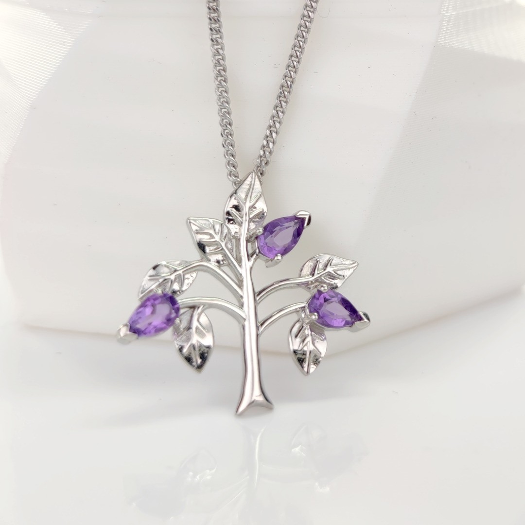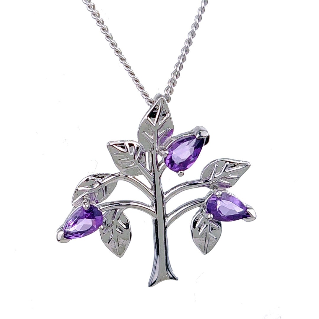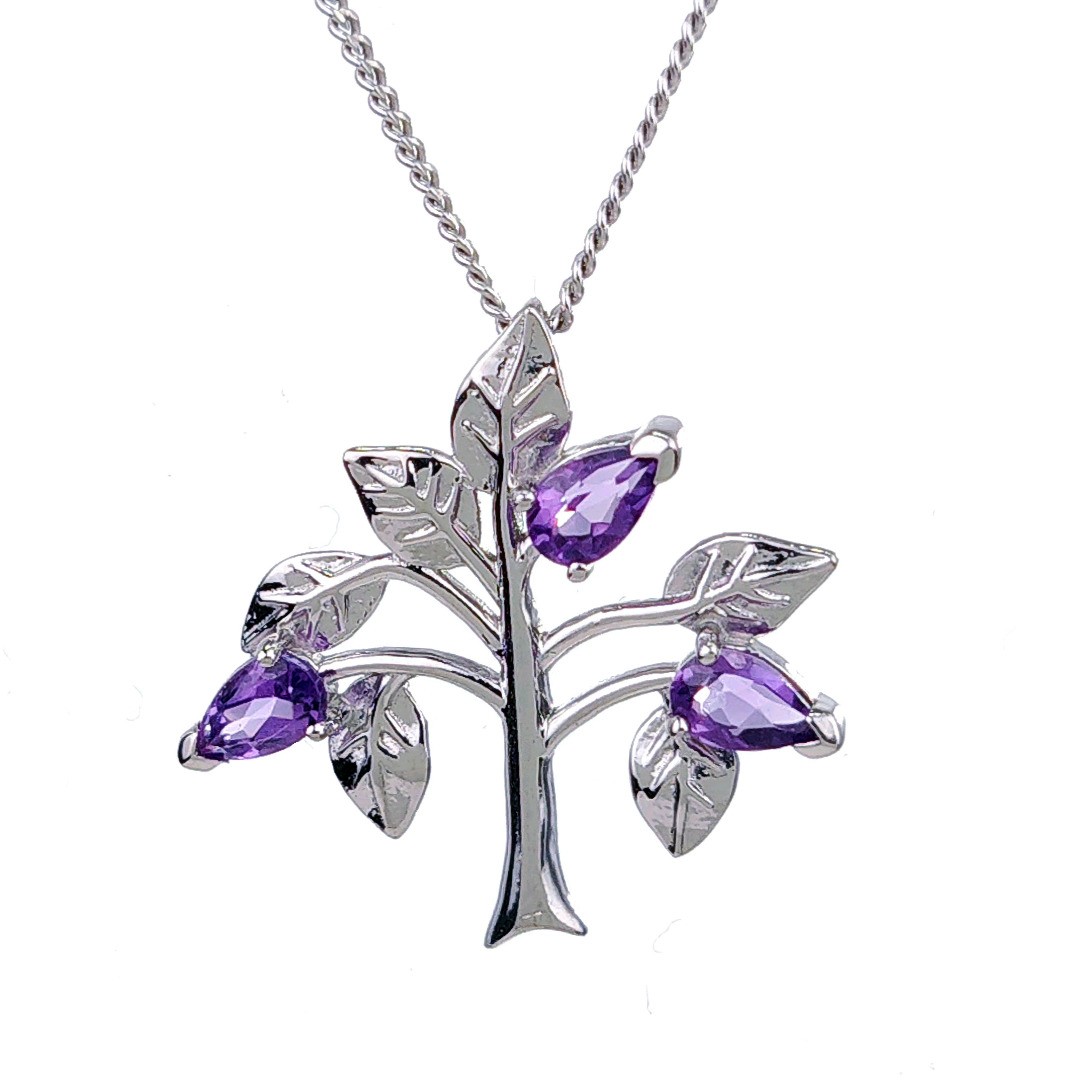 Elegant Tree of Life trilogy stone pendant set with three natural African elegant purple amethysts. The three amethysts are 3mm x 5mm giving a total carat weight of 0.6ct. An Ojewellery design the tree symbolising harmony balance and a connection to our roots. The trilogy of gemstones representing the passage of time. Each stone represents one element our past our present and our future. Amethysts are associated with calm and wisdom. They are the birthstone for February. This elegant pendant is suitable to wear for daytime or evening wear. It is supplied on an 18 inch sterling silver chain. Both the pendant and chain are finished with a commercial grade rhodium plate to give a high quality shine finish. Supplied in an Ojewellery presentation box within a ribbon handled gift bag complete with product information authenticity card with space for a gift message and a jewellery cleaning cloth to keep your jewellery in ready to wear condition. Specification: Chain: 18 inch Curb link with spring ring fastening Width: 21.5 mm Height: 20 mm Weight of pendant and chain: 3.71g